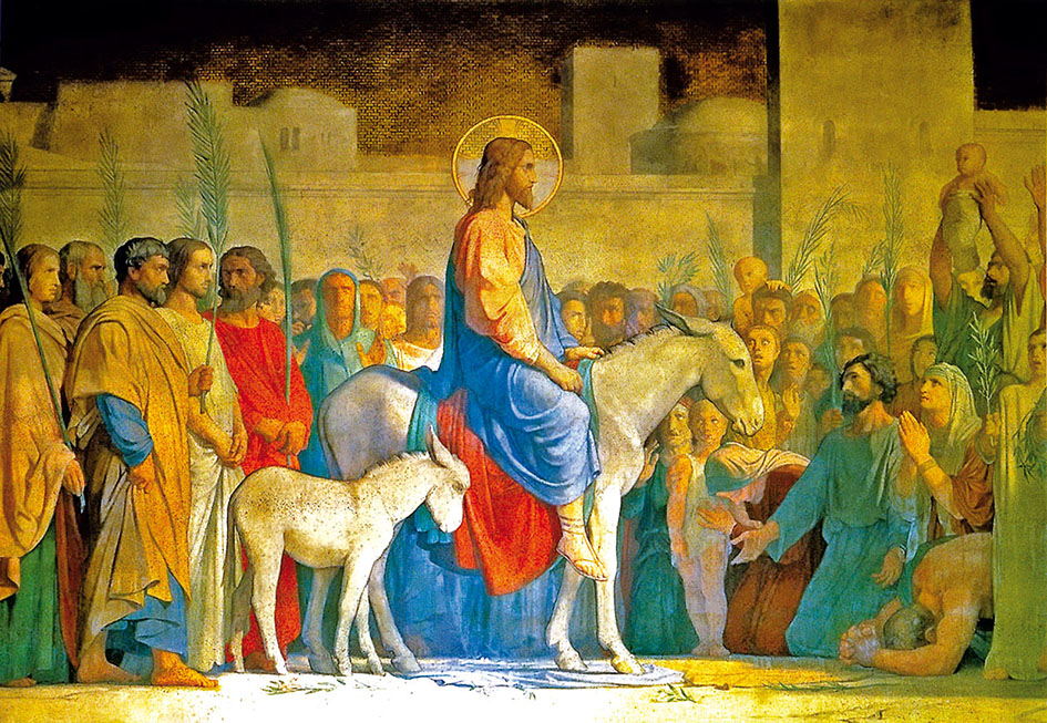 Jesus besucht in Jerusalem das Passahfest und reitet auf einem Esel in die Stadt ein. Damit protestiert er gegen die Militärmacht der Römer, die zu jedem Fest mit Kohorten in Jerusalem einritten, um für Ruhe und Ordnung zu sorgen. Die Menge feiert ihn als messianischen König: „Gesegnet sei das Reich unseres Vaters David, das nun kommt!“ Palmzweige sind ein antikes Triumphsymbol, mit dem die Juden ihre Siege über Nichtjuden feierten. Jesus hatte offenbar messianische Hoffnungen der Landbevölkerung geweckt, etwa indem er den Armen den Landbesitz zusagte (Matthäus 5, 3). Der Einzug bedeutet eine Konfrontation mit den Machteliten der Sadduzäer und Römer.