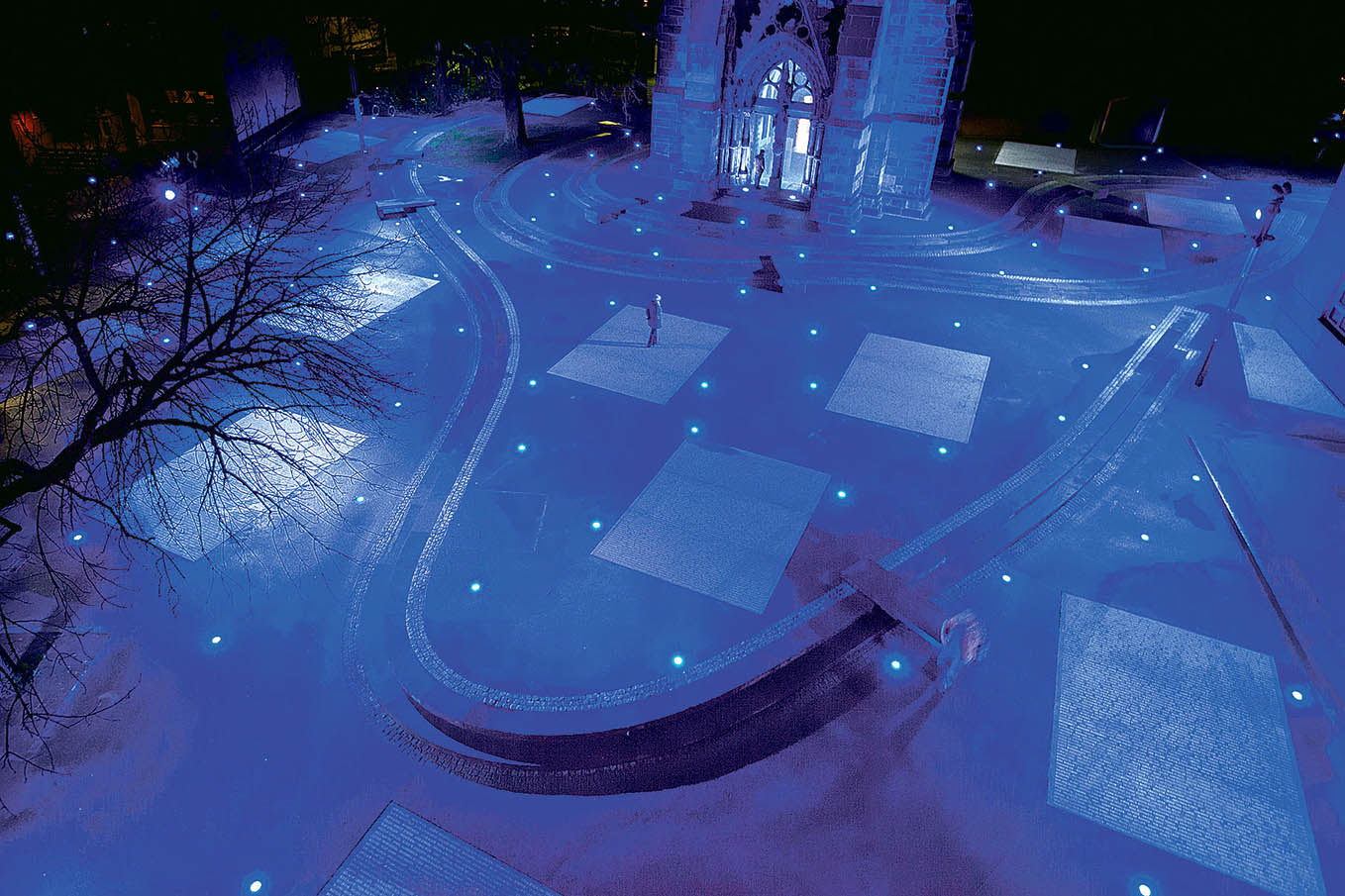 Das Foto lässt es schon erahnen: Auf dem Platz des Europäischen Versprechens vor der Christuskirche in Bochum sind nicht, wie in UK gemeldet, nur 4726 Namen verzeichnet, sondern deutlich mehr: Genau 14 726. Die Menschen, deren Namen in Basaltlava-Platten eingraviert sind, haben ein „geheimes Versprechen“ für Europa gegeben, so die Idee des Künstlers Jochen Gerz. Wichtig sei es ihm gewesen, dass der Platz nicht nur gut aussehe, sondern auch einen Sinn habe, erklärte der Künstler. Im Turm der Christuskirche, in dem die erste Platte des Projektes verlegt wurde, befindet sich ein Mosaik aus dem Jahr 1931 mit den Namen von 1358 Bochumern, die im Ersten Weltkrieg gefallen sind, sowie von 28 „Feindstaaten“. Dieser „Heldengedenkraum“ dient schon seit Längerem als Mahnmal gegen Krieg und Gewalt. Der wiederaufgebaute Kirchraum ist seit 2001 „Kirche der Kulturen“. leg/Foto: PEV/Patrick Skrypczak