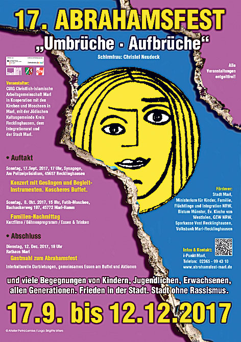 MARL – Zum 17. Mal wird in Marl das Abrahamsfest als Begegnung der „abrahamitischen“ Religionen Judentum, Christentum und Islam gefeiert. Die diesjährige Veranstaltungsreihe unter dem Motto „Umbrüche, Aufbrüche“ beginnt am 17. September um 17 Uhr in der Synagoge in Recklinghausen mit einem Konzert und endet am 12. Dezember um 18 Uhr mit einem Gastmahl im Rathaus in Marl. Ein weiterer Höhepunkt ist ein Familiennachmittag für alle Generationen am 8. Oktober um 15 Uhr in der Fatih-Moschee in Marl-Hamm mit Kurz-Filmen und Kinderprogramm.