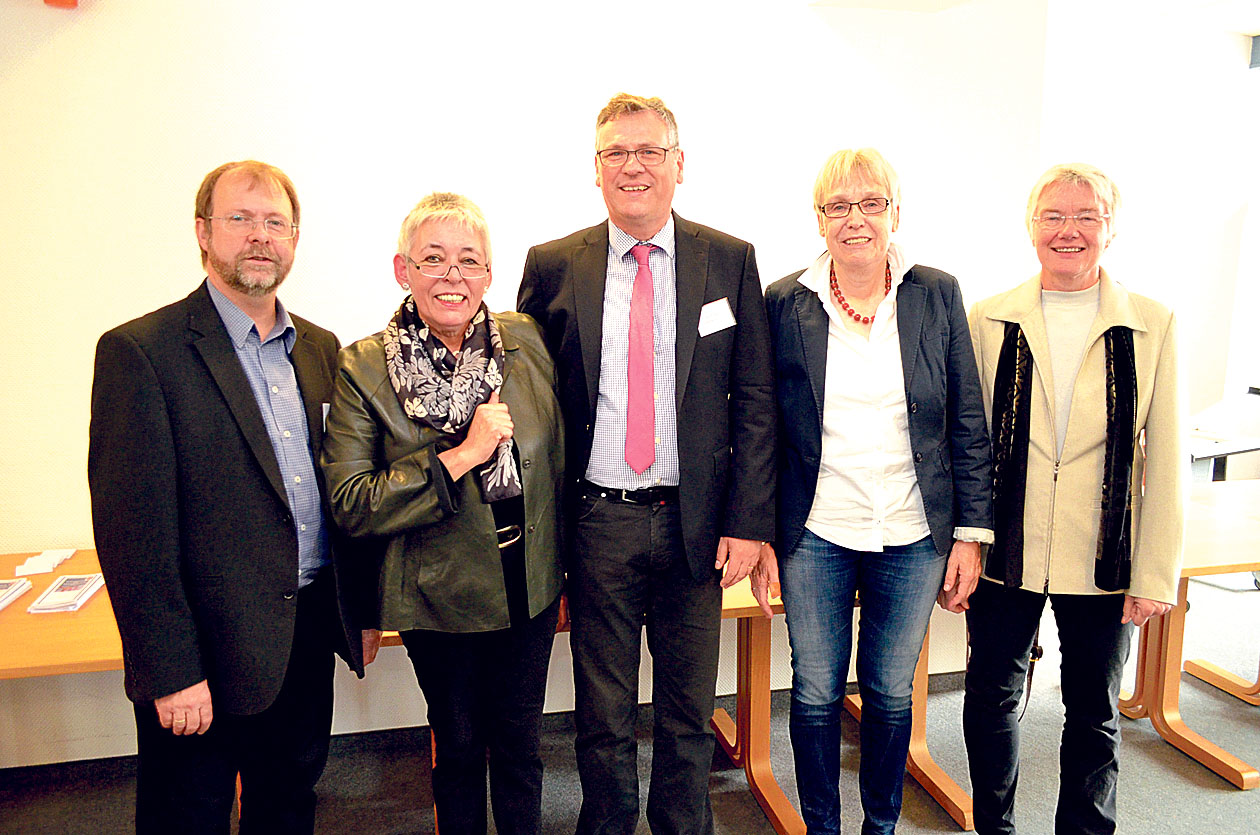 Mit einer Fachtagung in Dortmund blickte die Gemeindeberatung und Organisationsentwicklung in der Evangelischen Kirche von Westfalen auf ein 20-jähriges Bestehen zurück. Impulsgeber in der Veranstaltung waren Cornelia Fauser (BASF-Stiftung/Employee Assistance Program) und Gerd Bauz (Institutsleiter ipos). Vorbereitende und Teilnehmende der Tagung waren unter anderem (v.l.): Frank Pawellek (Sprecher des Beirats der Gemeindeberatung), Oberkirchenrätin Doris Damke (zuständige Dezernentin), Ernst-Eduard Lambeck (landeskirchlicher Pfarrer für Gemeindeberatung/Organisationsentwicklung), Birgit Winterhoff (Leiterin des Amtes für missionarische Dienste) und Kerstin Neddermeyer (Pfarrerin/Gemeindeberaterin).