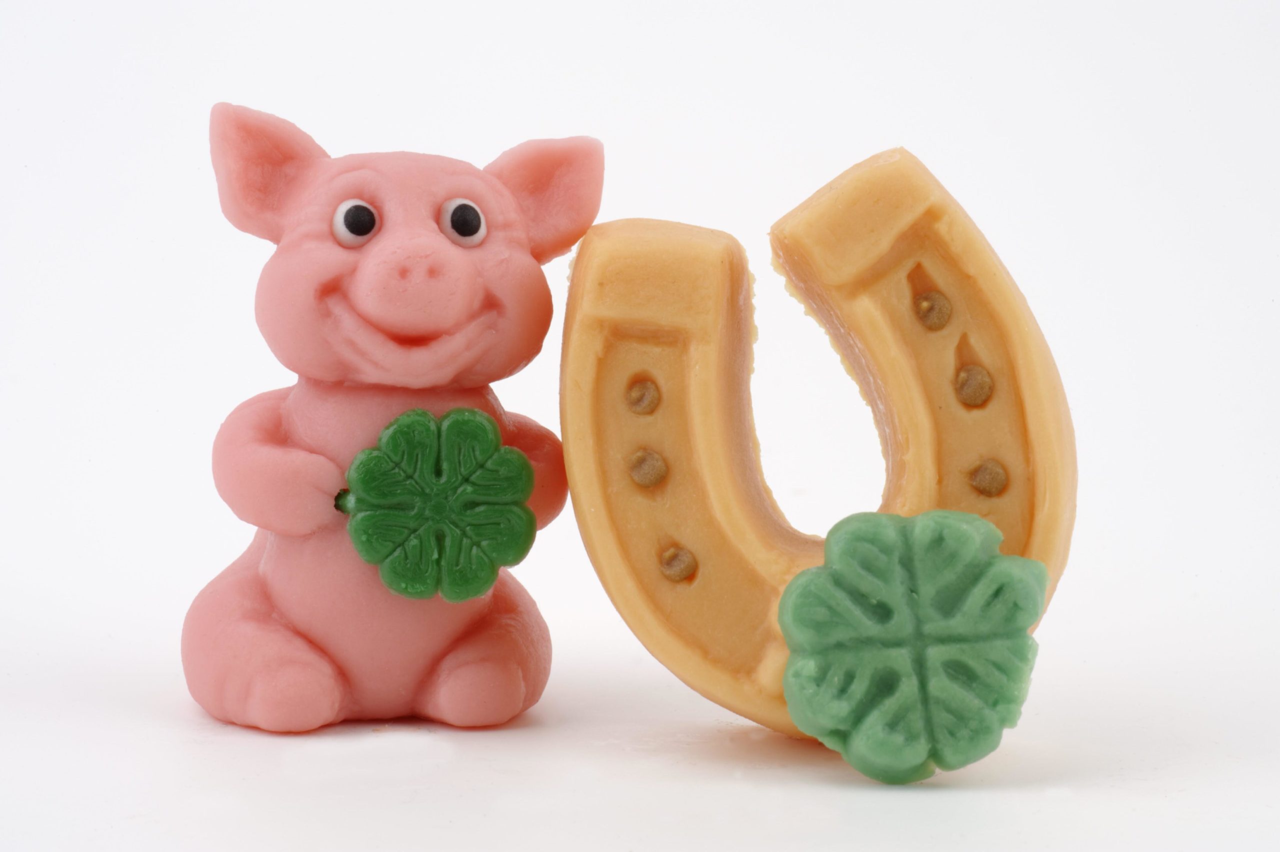 Das Schwein galt schon bei den alten Griechen als Opfertier für die Fruchtbarkeitsgöttin. Dass es zum Glückssymbol wurde, liegt auch daran, dass es kein besonderes Futter braucht und schon nach sechs Monaten schlachtreif und nutzbar für den Menschen ist. Der zum Start in den Reichtum dienende Glückspfennig ist in den Euro-Ländern zwar dem etwas argwöhnischer betrachteten Glückscent gewichen, wird aber im Handel gerne weiterhin zusammen mit einem Marzipanschwein samt Münze in der Schnauze und einem vierblättrigen Kleeblatt oder einem kleinen goldigen Hufeisen verkauft. Ein nach rechts offenes Hufeisen soll dabei nach altem Brauch ein C für Christus darstellen.