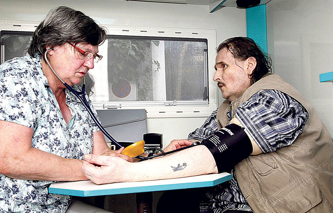 Viele von Krolls Patienten haben chronische Krankheiten, die durch die Lebensumstände noch verschärft werden. „Wer keinen festen Wohnsitz hat, kann sich nicht so einfach ausruhen, sich um seinen Körper oder gesunde Ernährung kümmern“, erklärt die Ärztin. Herz-Kreislauf-Erkrankungen und Verschleißerscheinungen seien an der Tagesordnung. Hinzu kämen die Folgen von Alkohol- und Drogenkonsum sowie psychische Erkrankungen.