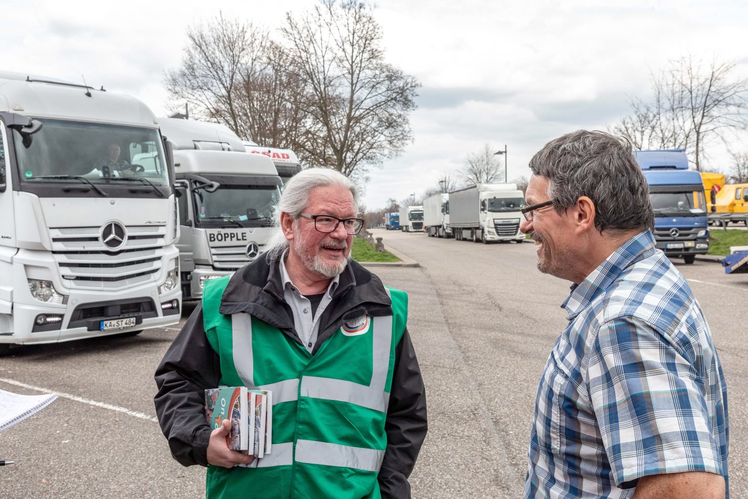 Er klopft an die nächste Fahrertür: "Ich bin von der Fernfahrer Seelsorge. Und ich wollte mich bedanken für das, was Du leistest." Sein Gegenüber – zwei Meter höher in der Fahrerkabine – schaut zunächst verdutzt, bevor er sich bedankt und runterhüpft von seinem Bock. "Da muss ich euch enttäuschen", sagt der Mann im blau-weiß karierten Hemd. "Ich jammer nicht. Mir geht es gut."