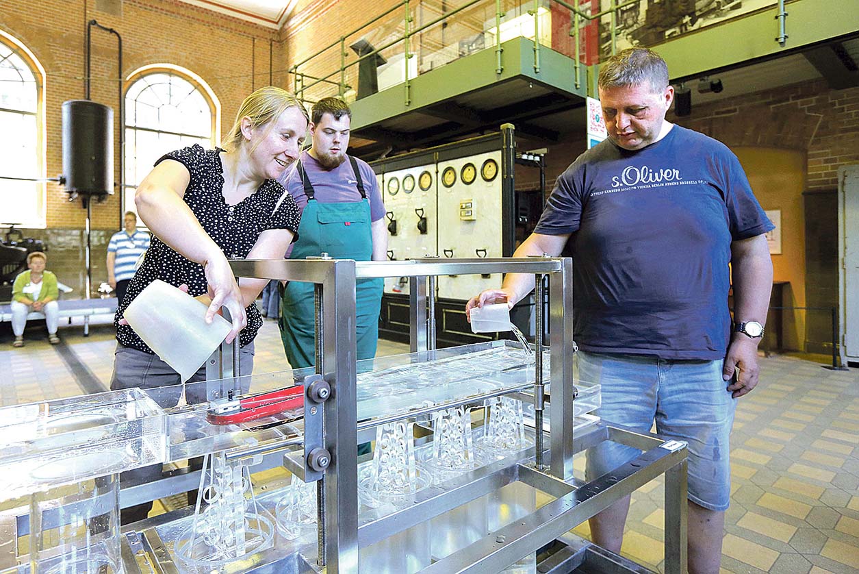 Maissner und Bialluch binden gern die Zuhörer aktiv mit ein. So dürfen die an einer Station selbst Schleusenwärter spielen und solange Wasser umfüllen, bis das kleine Modellschiff vom Ober- ins Unterwasser fahren kann. „Dürfen wir das auch nochmal rückwärts machen?“, fragt ein Teilnehmer. Klar, dürfen sie!