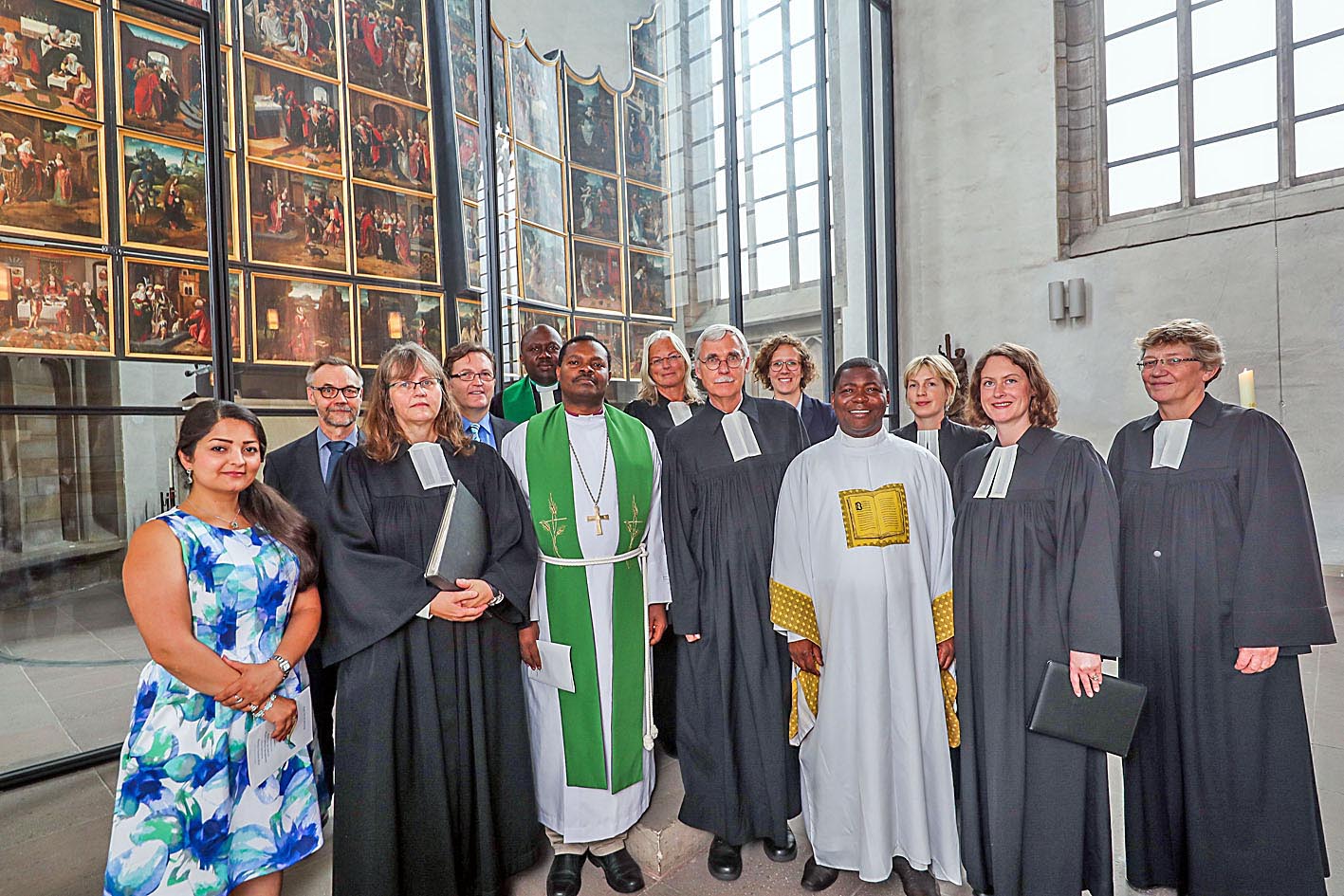 Abschied und Neubeginn. Im landeskirchlichen Amt für Mission, Ökumene und kirchliche Weltverantwortung (MÖWe) gibt es personelle Wechsel: Pfarrerin Ute Hedrich (3. v. li.) verlässt die Einrichtung nach mehr als 15 Jahren und geht als Auslandspfarrerin der Evangelischen Kirche in Deutschland (EKD) nach Harare/Zimbabwe. Der bisherige MÖWe-Regionalpfarrer Dietrich Weinbrenner (Mitte) ist nun als Beauftragter für Nachhaltige Textilien bei der Vereinten Evangelischen Mission (VEM) tätig. Die derzeitige Hagener Pfarrerin Christina Biere (2. v. re.) übernimmt seine regionale Pfarrstelle. So stand ein Gottesdienst zur Verabschiedung und Begrüßung mit rund 170 Gästen in der Dortmunder Petrikirche unter dem Motto „Vom Geist bewegt …“.