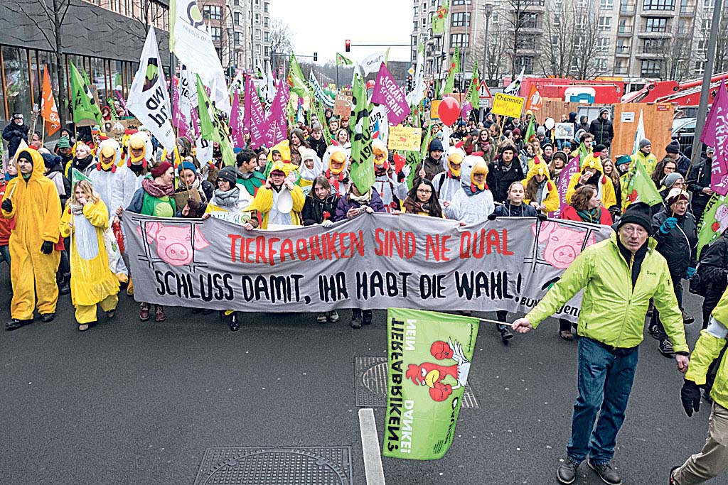 Thomas Schröder, Präsident des Deutschen Tierschutzbundes, kritisierte die Massentierhaltung. Das Tierschutzgesetz lasse immer noch „die millionenfache Qual von Tieren in landwirtschaftlicher Haltung zu“, sagte Schröder und nannte als Beispiele die massenweise Tötung männlicher lebensfähiger Küken und die Kastration von Ferkeln ohne Betäubung. „Das alles haben wir satt“, betonte Schröder. Auf Transparenten sprachen sich Demonstranten unter anderem gegen „Tierfabriken“, „Megaställe“ und „Landgrabbing“ aus.