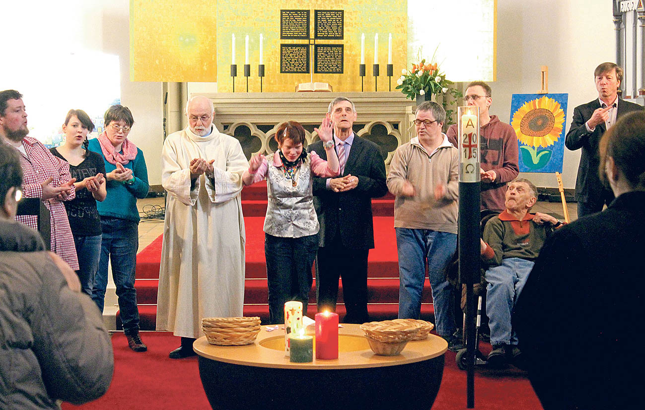 Aber Krüger geht noch weiter: „Wenn Kirche Kirche sein möchte, dann muss sie allen Glaubenden Zugang und – im Sinne des Priestertums aller Glaubenden – Beteiligung ermöglichen.“ Aus dieser Erkenntnis entwickelte er die Idee des Inklusiven Gottesdienstes, fand mit dem Gehörlosenseelsorger Martin Ruhmann vom Diakonischen Werk Herne und dem Gemeindereferenten Joseph Becker, der ein Behindertencafé in der Katholischen Gemeinde St. Josef leitet, sofort Mitstreiter.
