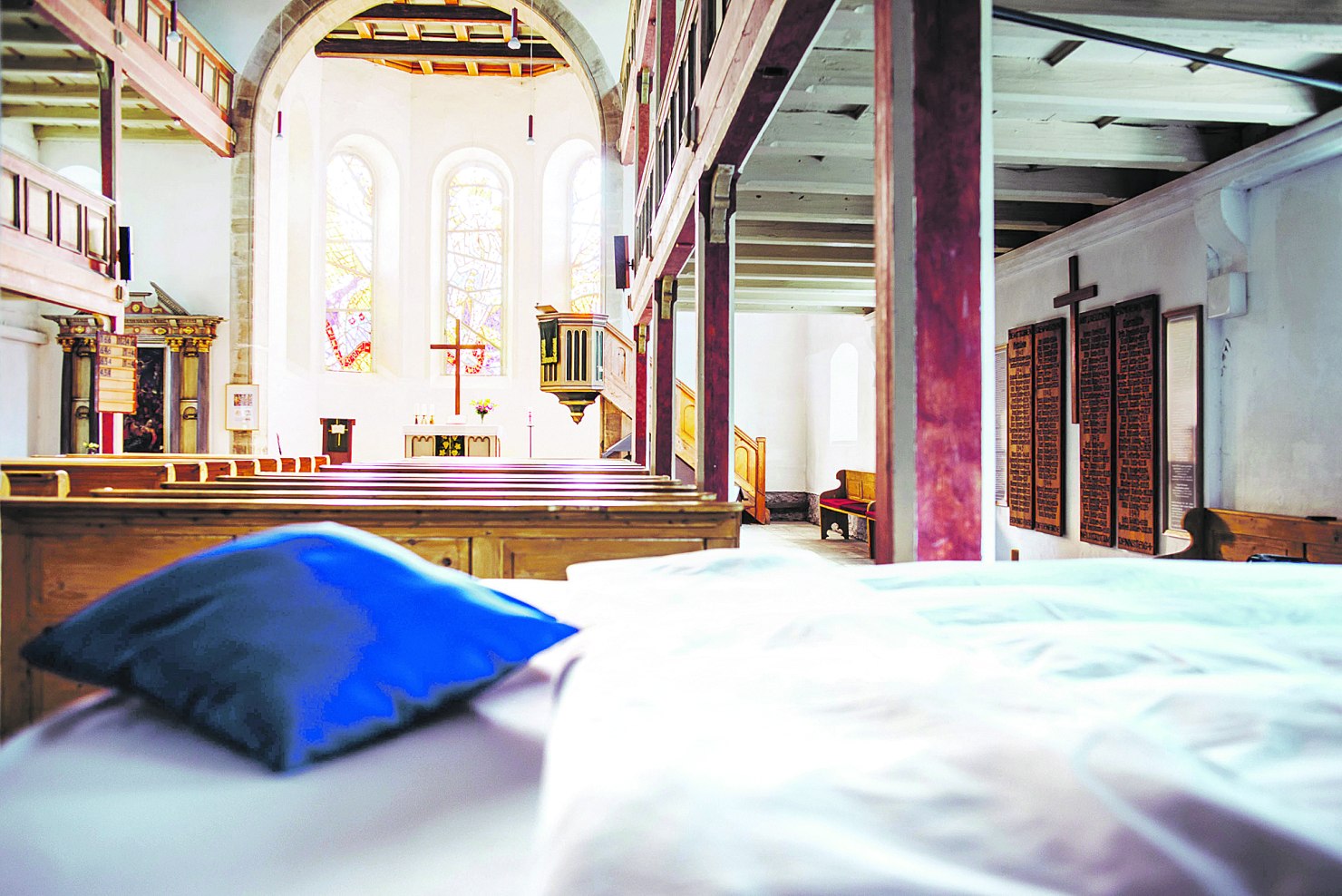 Ein junges Pärchen blinzelt in die Morgensonne. Monica und Meno aus den Niederlanden sind auf der Rückreise von Slowenien, wo sie ihren Urlaub verbrachten. Sie entdeckten im Internet dieses ungewöhnliche Übernachtungsangebot und machten dafür einen großen Umweg, was sie nicht bereuen. Begeistert schwärmen sie vom Rot der farbigen Glasfenster im Chor, dessen surreales Licht sie heute weckte. Geschlafen hätten sie gut, obgleich der große Bau auch ungewohnte Geräusche bereithielt. Die Organisation habe bestens geklappt – Zufriedenheit in jeder Hinsicht.
