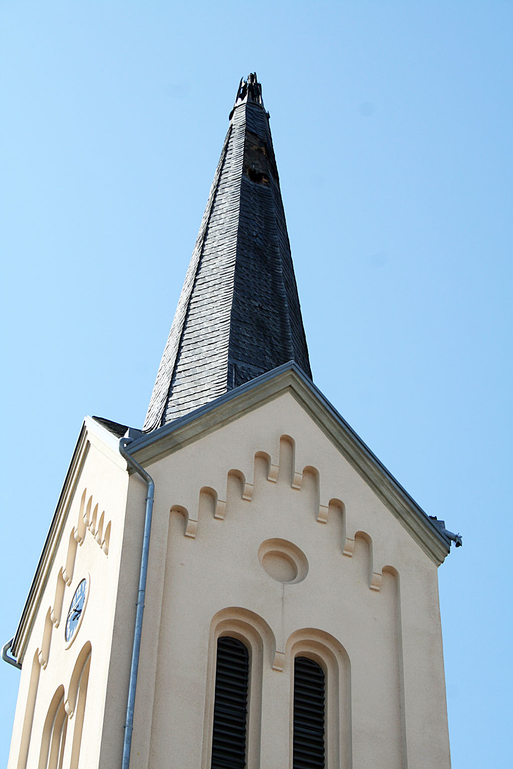 RECKLINGHAUSEN – Die heftigen Unwetter am vergangenen Wochenende haben die Gustav-Adolf-Kirche in Recklinghausen besonders hart getroffen: Am Sonntagmorgen schlug der Blitz unterhalb der Turmspitze ein und setzte das Dach in Brand. Die Feuerwehr konnte das Feuer löschen, bevor es auf den Kirchraum übergriff. Das Turmkreuz musste aber danach aus Sicherheitsgründen abmontiert werden, weil die Statik nicht mehr gewährleistet war. Die Kirche war im Jahr 2003 umfassend renoviert worden.