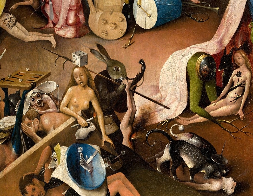 Als Hauptmerkmal der Kunst Boschs galt jedoch früh das Groteske, Hybride oder Monströse. In seinen berühmtesten Bildern «Die Versuchung des Heiligen Antonius» (um 1502), «Garten der Lüste» (um 1503) und «Das Jüngste Gericht» (um 1506) wimmelt es von dämonischen Mischwesen, halb Mensch, halb Tier oder Ding, die die zur Hölle Verdammten auf grausamste Weise quälen.