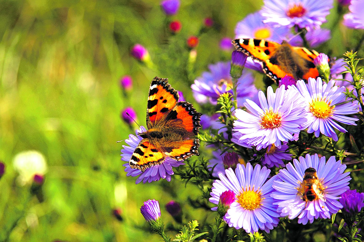 Denn Falter lieben blaue, rote und violette Blüten: Glattblatt- und Rauhblatt-Astern, Blaunessel, Wiesenflockenblume, Lavendel, Wiesensalbei, Karthäusernelke, Tauben-Skabiose, Blutweiderich und Gewöhnlicher Wasserdost. Aber Falter wie Kaisermantel, Tagpfauenauge, Distelfalter und Kleiner Fuchs fliegen auch auf den gelb blühenden Echten Alant.