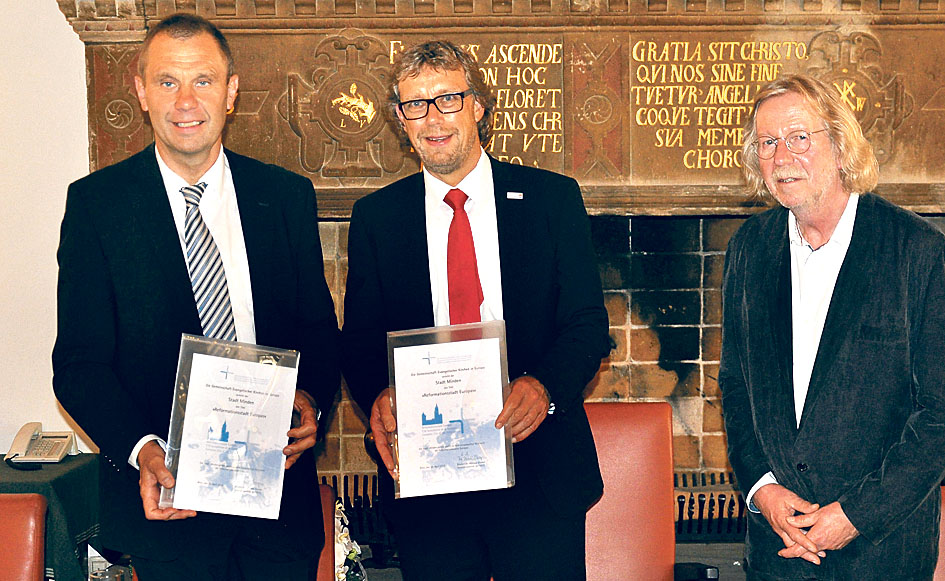 MINDEN – Die Stadt Minden hat den Titel „Reformationsstadt Europas“ verliehen bekommen – als einzige im Bereich der Evangelischen Kirche von Westfalen. Pfarrer Bernd Jaeger von der Gemeinschaft Europäischer Kirchen in Europa (GEKE) übergab die Urkunden an Bürgermeister Michael Jäcke und Superintendent Jürgen Tiemann.