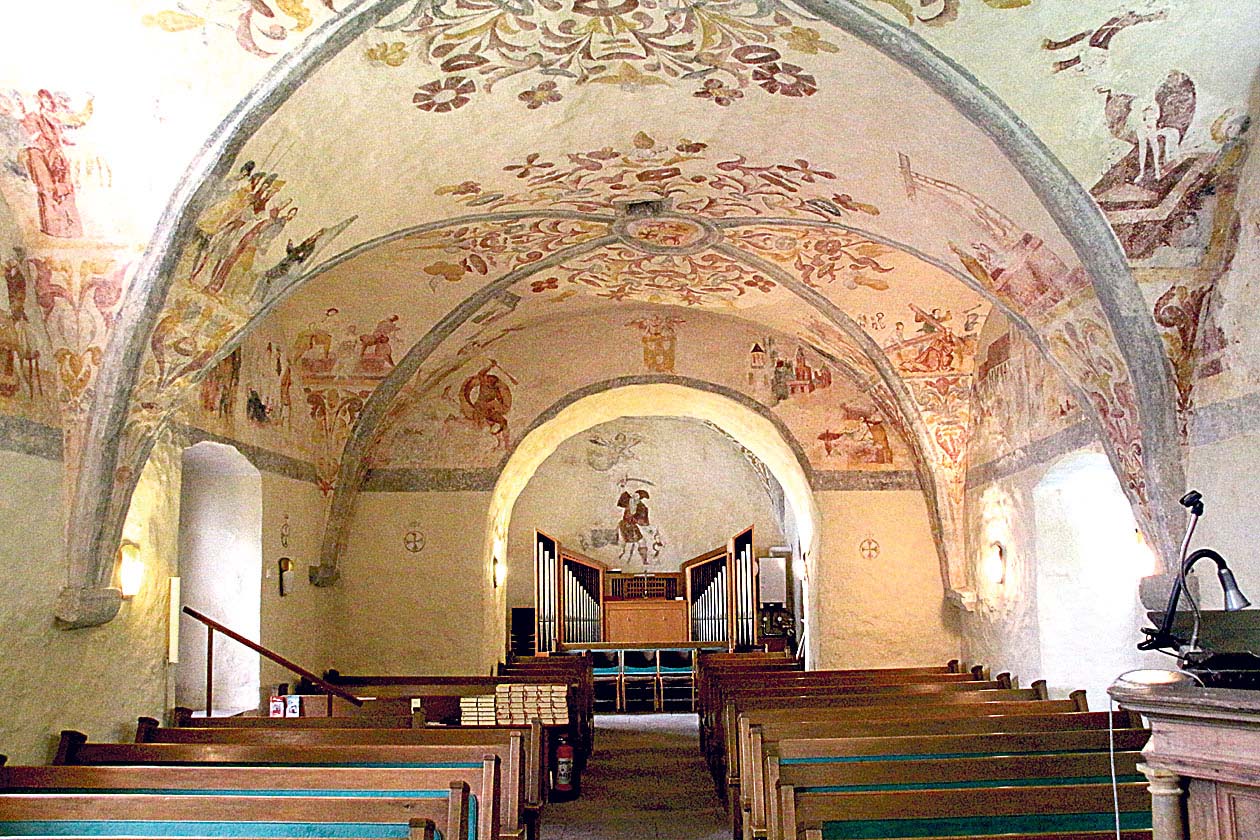 Mit der Freilegung kamen jedoch gleich die Probleme: Aus einer unentdeckten Lücke im Mauerwerk sickerte Wasser unter den Fußboden des Kirchleins. „Die Luftfeuchtigkeit betrug hier bei Gottesdiensten manchmal über 90 Prozent“, erzählt Victoria Keil. Das ließ den Putz aufquellen. Er löste sich von der Wand; dazu kam ein rötliches Bakterium, das ganze Flächen überwucherte. Dank umfangreicher Restaurierungsarbeiten konnten die Gemälde inzwischen gesichert werden.