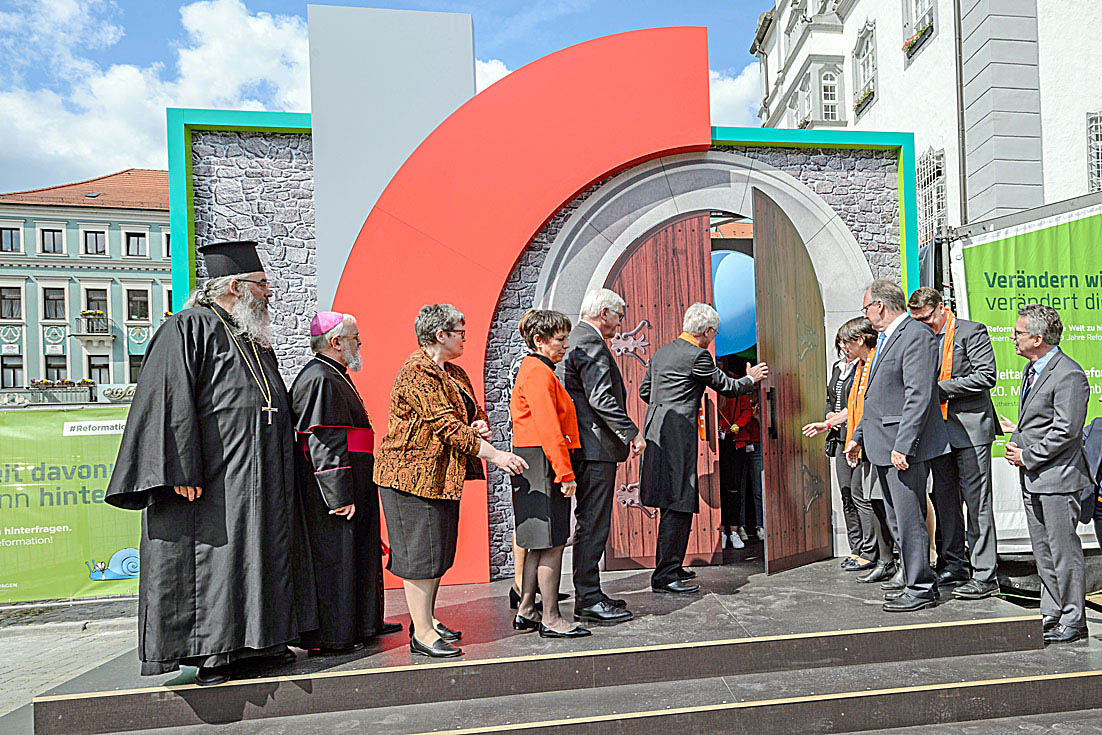 Wittenberg – Kurz vor dem großen Festwochenende zum 500. Reformationsjubiläum ist in Wittenberg die Weltausstellung Reformation „Tore der Freiheit“ eröffnet worden. In Anwesenheit von Bundespräsident Frank-Walter Steinmeier öffnete der Ratsvorsitzende der Evangelischen Kirche in Deutschland (EKD), Heinrich Bedford-Strohm, anschließend symbolisch ein Tor der Weltausstellung. Spitzenvertreter von Kirche und Politik unterstrichen die weitreichenden Folgen der Kirchenerneuerungsbewegung bis heute.