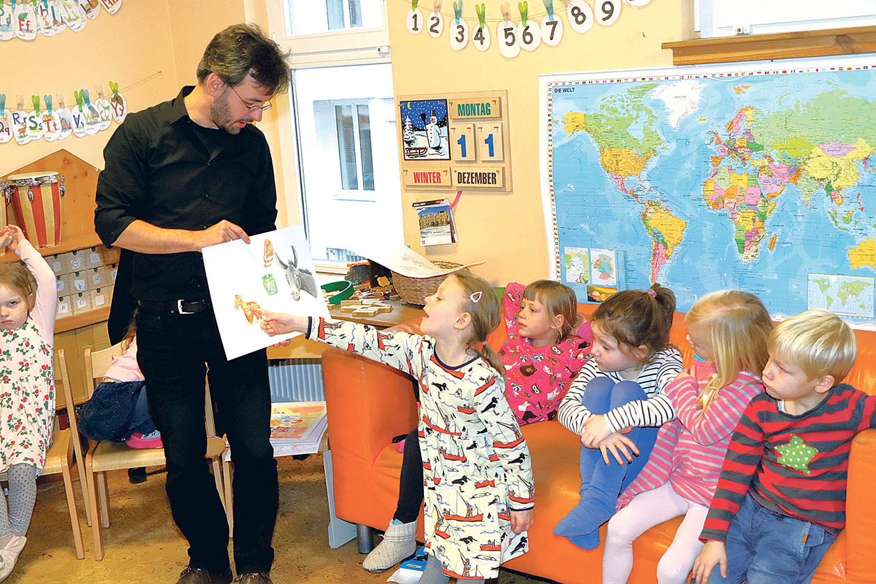 Ob es heute auch deswegen so ruhig in der Sonnengruppe ist, weil Gäste da sind? Volker Konrad berichtet den Kindern davon, wie er die Bilder malt. Erst einmal zeigt er den Kindern das Buch und fragt: „Was seht ihr da?“ Mathilda sieht Leute. Und den Stern. „Der sieht aus wie ein Plätzchen“, sagt sie. Da schmunzelt auch der Künstler und gibt dem Mädchen recht. „Wie hast du das gemalt?“, will ein Junge wissen. „Erst mache ich Skizzen mit einem Bleistift“, schildert Volker Konrad. „Dann zeige ich das den Leuten im Verlag. Die sagen mir dann, ob es so okay ist.“ Die Kinder hören aufmerksam zu und schauen sich die Skizzen an, die der Künstler auf dem Boden ausgebreitet hat. „Dann erst male ich die Bilder mit Wasserfarben – so wie ihr auch.“
