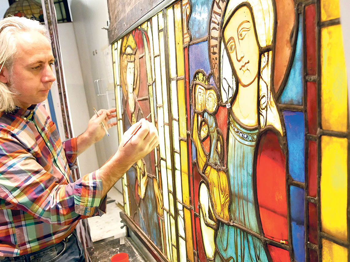 Die Ehrfurcht ist spürbar, flutet den ganzen Raum wie das Sonnenlicht, das durch die Fenster bricht. Vorsichtig. Ganz vorsichtig setzt Christoph Sanders den Pinsel auf die Glasscheibe und bewegt ihn sanft hin und her. Fast schon meditativ sind die Bewegungen des erfahrenen Glaskünstlers. Hier spürt man den Atem der Jahrhunderte.