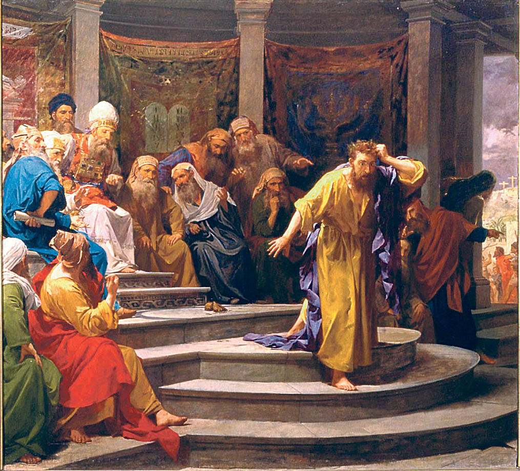 Judas spricht als Einziger die Wahrheit im Prozess aus: „Ein Unschuldiger wird getötet.“ Und dann vollzieht er an sich selbst das Urteil, das nach jüdischem Recht über den zu verhängen ist, der eine falsche Anklage erhoben hat. Denn falsche Ankläger sollen mit derselben Strafe bestraft werden, die sie über den bringen wollten, den sie angeschuldigt haben. Diese Strafe exekutiert Judas recht eigentlich an sich selbst.