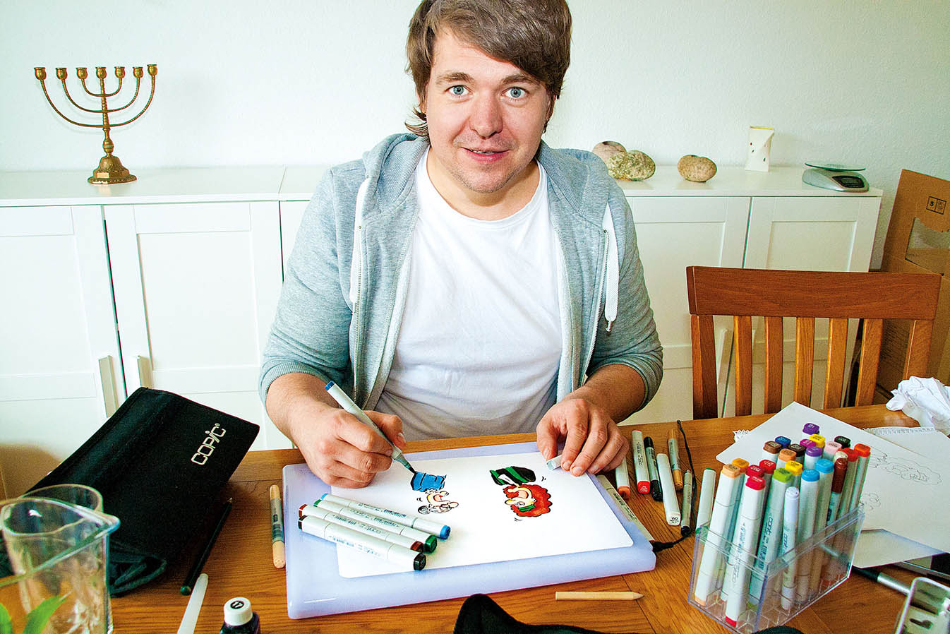 Im Flur und im Wohnzimmer stehen noch Umzugskisten, die darauf warten, ausgepackt zu werden. „Alles schön nacheinander“, sagt Holger Pyka. Ihn scheint so schnell nichts aus der Ruhe zu bringen. Er weiß, in welcher Kiste er nach seinen Zeichenutensilien suchen muss. Da ist es, das Leuchtbrett. Darauf kommt nun der Bleistiftentwurf, darüber wieder ein weißes Blatt und er beginnt mit Tusche oder einem schwarzen Stift abzupausen. Das Ganze wird dann abgescannt und am Computer eingefärbt. Aber er hat auch kräftig leuchtende Stifte, mit denen er seine Figuren ausmalen kann.