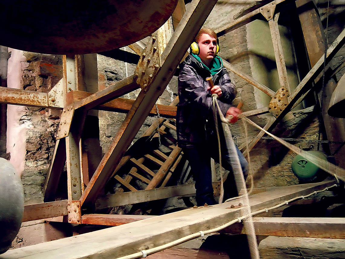 „Das hat natürlich auch Sicherheitsgründe“, erklärt der Student Alexander Baimann. Denn so ganz ungefährlich ist das Beiern nicht. Nicht nur der Aufgang über die ausgetretenen Steinstufen und die drei Leitern hat es in sich. Auch oben muss man jeden Schritt sorgsam setzen, um sich nicht den Kopf am Stahlgerippe einzuschlagen oder in eine der Ketten zu geraten, die die Glocken bewegen.