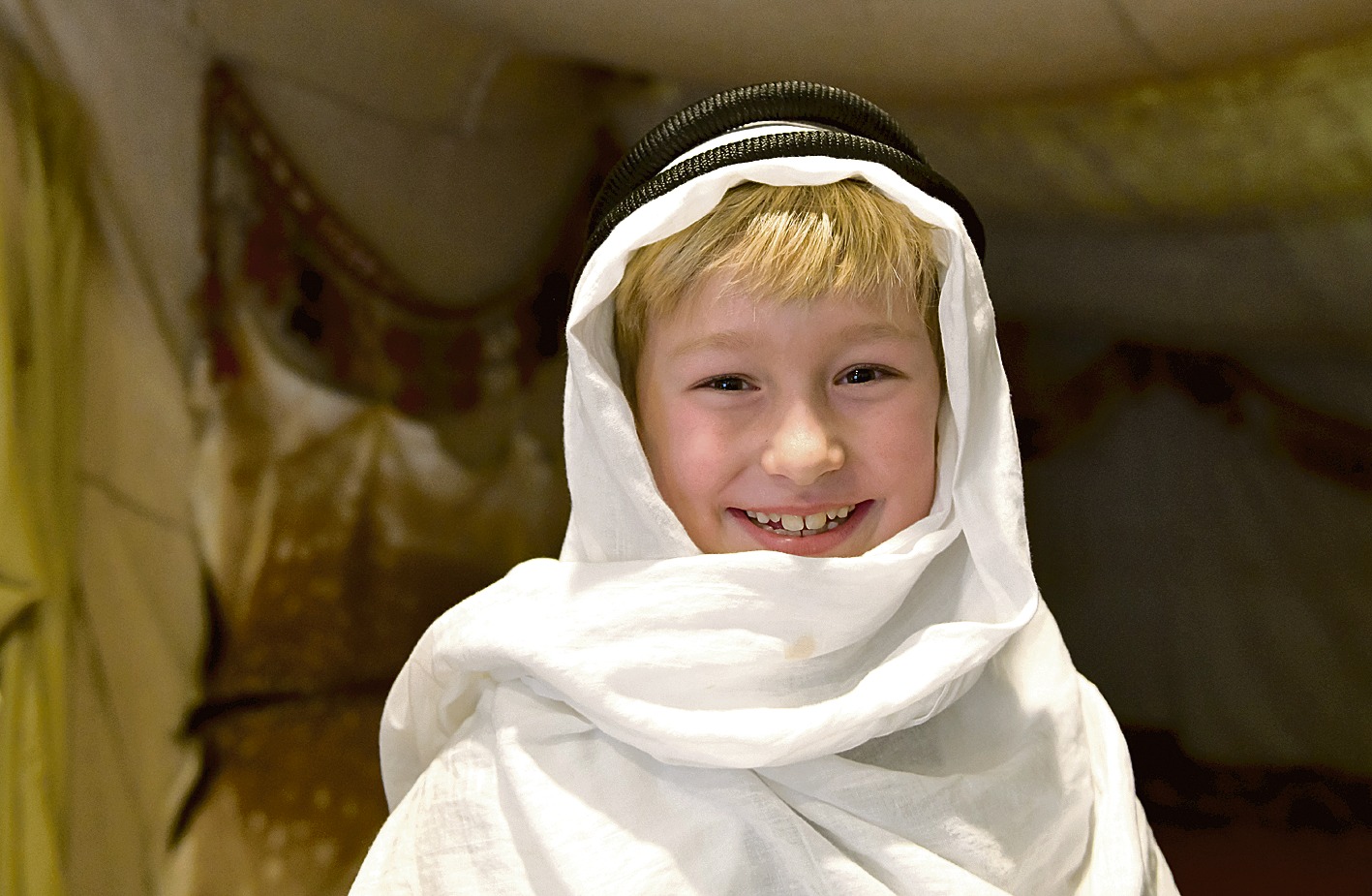 „Muss ich jetzt die ganze Zeit so rumlaufen?“ David beschleichen Zweifel, ob die Sache mit dem Beduinenkostüm eine so gute Idee war. Der Drittklässler, angetan mit einem weißen, weiten Gewand und der traditionellen Kopfbedeckung, der Kufiya, steht im ersten Stock des Bibelhauses in Frankfurt am Main. Hinter ihm: ein klassisches Nomadenzelt aus beigem Tuch. Vor ihm: eine Gruppe feixender Altersgenossen aus den beiden Kommuniongruppen der Gemeinde Sankt Martin in Dietzenbach: „Du siehst aus wie ein Pfarrer.“