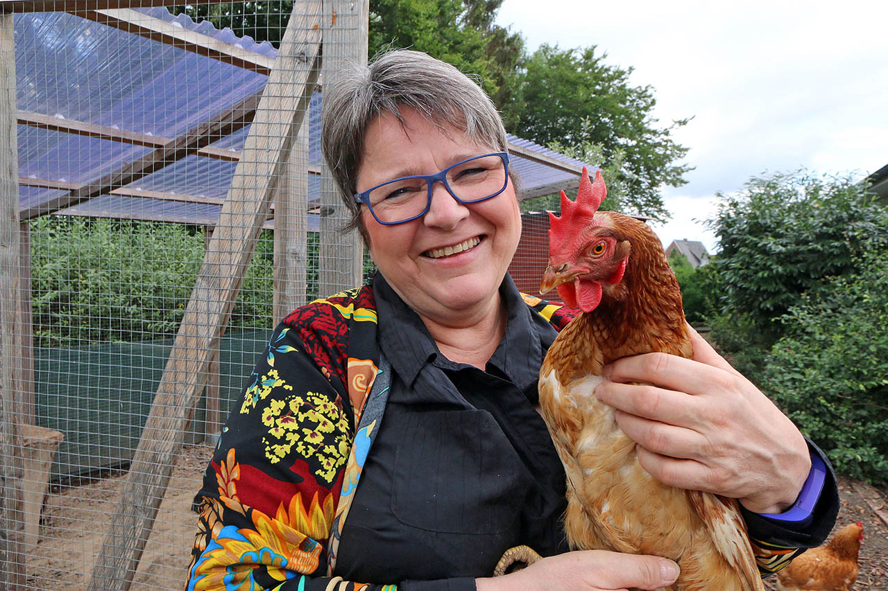 Agatha ist eher schüchtern, Carölchen zerstreut. Dorchen ist zickig, Emmi quasselig, Gitte divenhaft. Riekchen ist die pfiffigste, mit Kämpferherz. Im Garten von Pastorin Jeannette Querfurth in Süstedt bei Bremen tummelt sich eine kleine Schar quicklebendiger Hühner mit prächtigen Federn und straff-roten Kämmen, die jetzt nur wegen der großen Sommerhitze gelegentlich etwas durchhängen. Sie picken und scharren, was der Boden hergibt. Dass es so weit kommen konnte, war eigentlich gar nicht vorgesehen. Nur mit großem Hühnerglück sind sie dem Schlachthof entronnen.