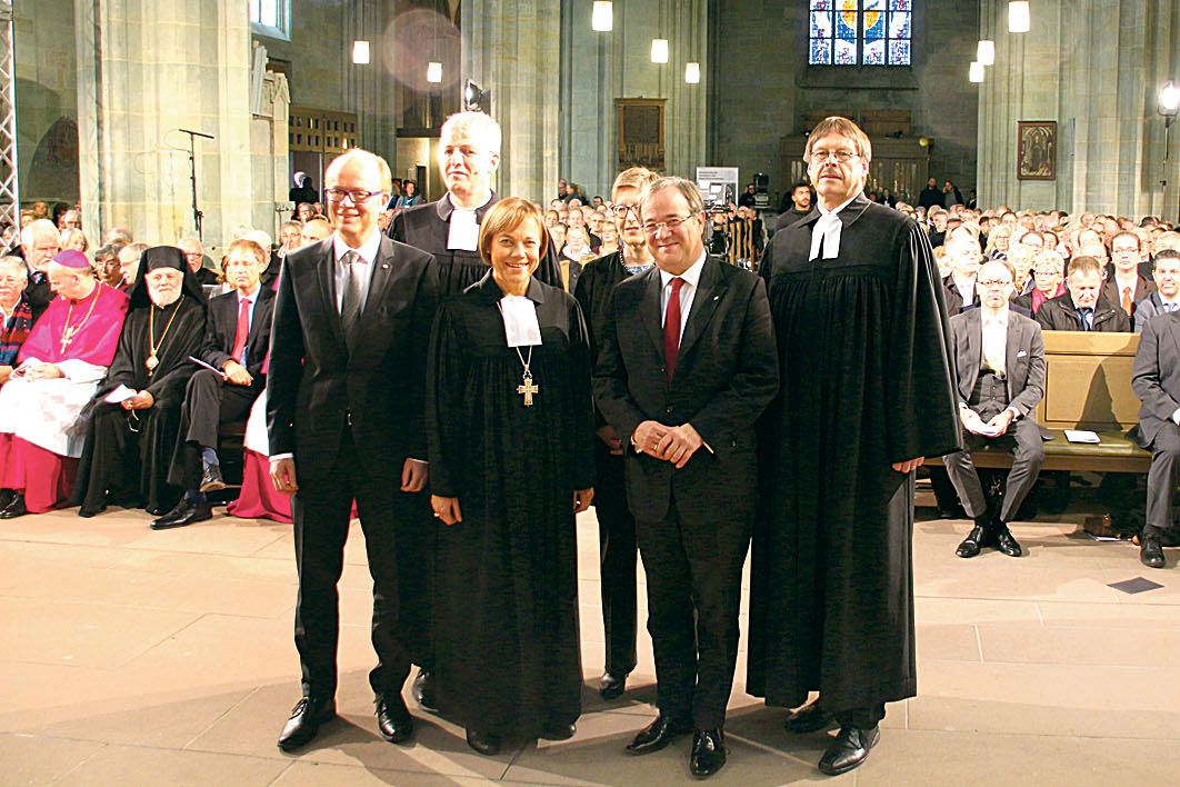 Da ist zum Beispiel Armin Laschet, Ministerpräsident von Nordrhein-Westfalen und aktiver katholischer Christ, der in diesem evangelischen Gottesdienst das Evangelium liest. Da sind die Bischöfe Franz-Josef Overbeck aus Essen und Hans-Josef Becker aus Paderborn, die in der ersten Reihe tapfer „Ein feste Burg ist unser Gott“ mitsingen.
