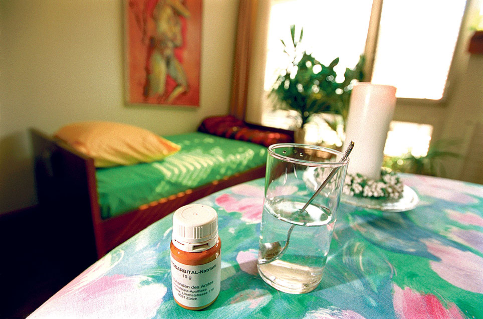 Am nächsten Morgen: Irgendwann ist der Kaffee ausgetrunken. Es bleibt nur noch der Weg zum Sterbezimmer. Drei solcher Räume befinden sich in dem Gebäude von „Dignitas“, alle mit einer Terrassentür zum Garten hin, durch die man auch eintritt. Eingerichtet sind sie mit einem großen Tisch, einem Sofa und einem Bett auf Rollen. An den Wänden hängen ein paar Bilder in Goldrahmen; einige Bücher und CDs stehen auf einem Regal in der Ecke. „Man kann sich Musik wünschen und religiöse Symbole, zum Beispiel ein Kreuz“, erzählt Markus. Gerold will nichts davon.