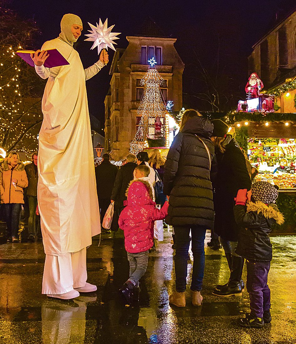 Auch das besondere Angebot, das die Reinoldi-Gemeinde im Advent macht, ist beliebt: „ViertelSternStunde“ heißt die Kurzandacht um 18 Uhr, die Pfarrerin Susanne Karmeier mit einem Team anbietet. Mehrere hundert Menschen folgen allabendlich der Einladung eines drei Meter hoher Stelzenläufers, der den Weg in die Kirche weist. Dort gibt es vertraute Adventslieder und „herzerwärmende Geschichten“, die den Kern der Weihnachtsbotschaft ausmalen. „Da sind ganz viele dabei, die sonst nie in die Kirche gehen“, hat Pfarrerin Karmeier beobachtet. „Manche kommen extra wegen dieser Andacht zum Dortmunder Weihnachtsmarkt.“
