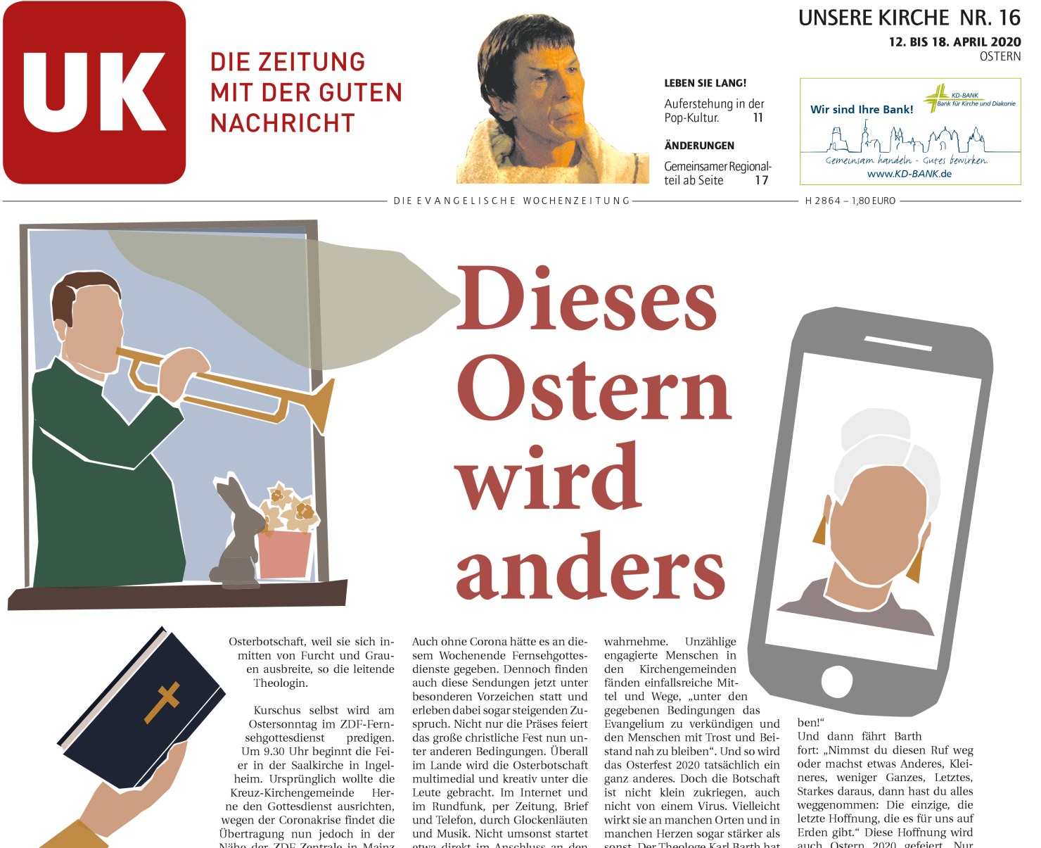 Auch ohne Corona hätte es an diesem Wochenende Fernsehgottesdienste gegeben. Dennoch finden auch diese Sendungen jetzt unter besonderen Vorzeichen statt und erleben dabei sogar steigenden Zuspruch. Nicht nur die Präses feiert das große christliche Fest nun unter anderen Bedingungen. Überall im Lande wird die Osterbotschaft multimedial und kreativ unter die Leute gebracht. Im Internet und im Rundfunk, per Zeitung, Brief und Telefon, durch Glockenläuten und Musik.