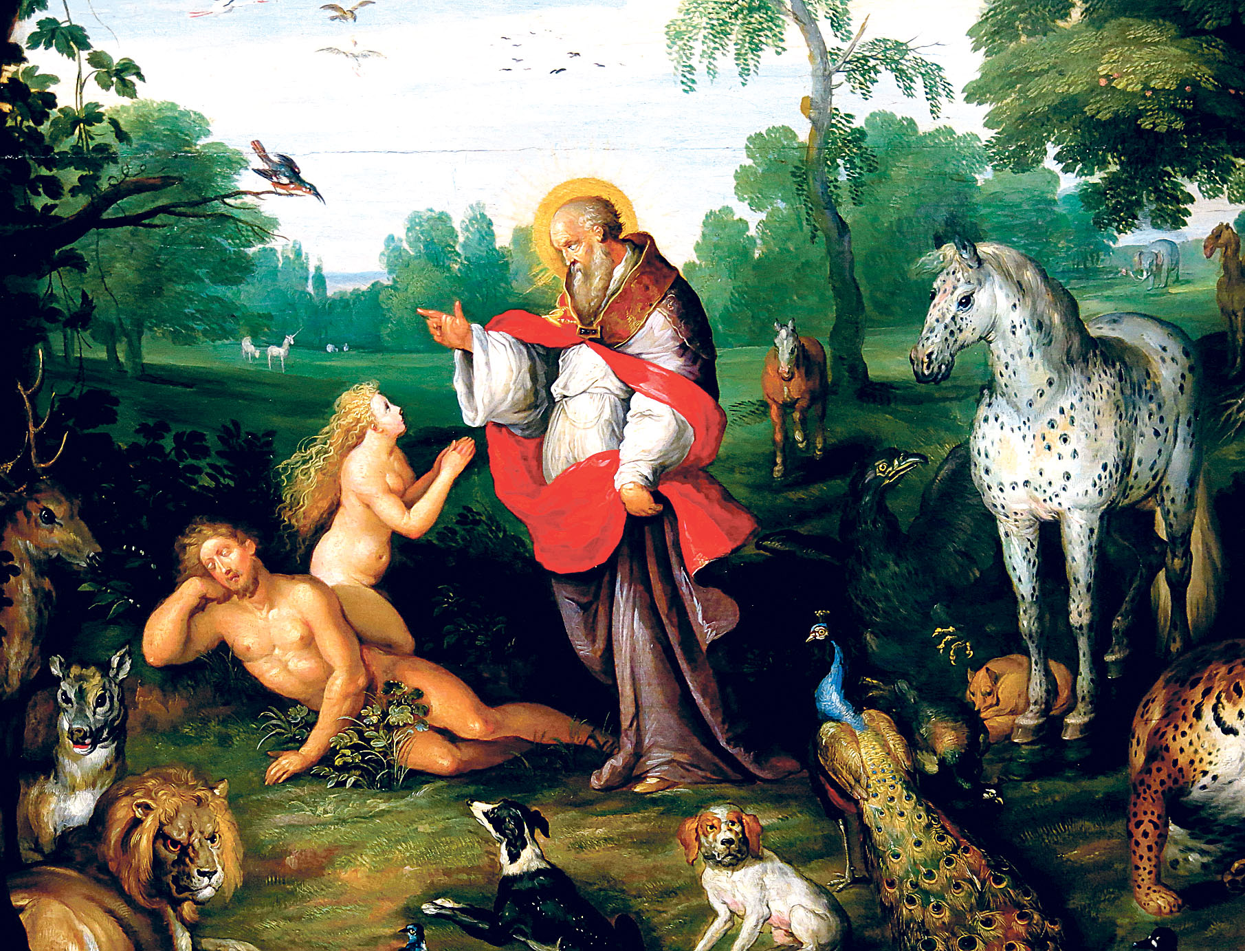 Neben solch höllenhaften Landschaften hatte Jan Breughel der Ältere mit Paradieslandschaften großen Erfolg. Ihre mit wechselnder Tierbesetzung aufwartenden farbenprächtigen Variationen waren auch für seinen Sohn Jan Breughel den Jüngeren ein Verkaufsschlager. Ein vom Junior produziertes Beispiel ist ausgestellt: die „Paradieslandschaft mit der Erschaffung Evas“. Links schlummert Adam. Vor ihm steht Gottvater, zu dem Eva mit gefalteten Händen aufblickt. Zeugen ihrer Erschaffung sind Löwe, Pfau und viele andere Tiere. Besonders aufmerksam schaut ein Apfelschimmel zu. Spät dran sind Esel und Ochse, die eben erst herantrotten. Dass Adam und Eva sich in den schönen Gefilden nicht zu benehmen wussten, ist im Mittel- und Hintergrund ausgemalt: Auf den Sündenfall folgt die Vertreibung. Ein am Wegesrand stehendes Straußenpaar schaut den Flüchtenden verdutzt entgegen.