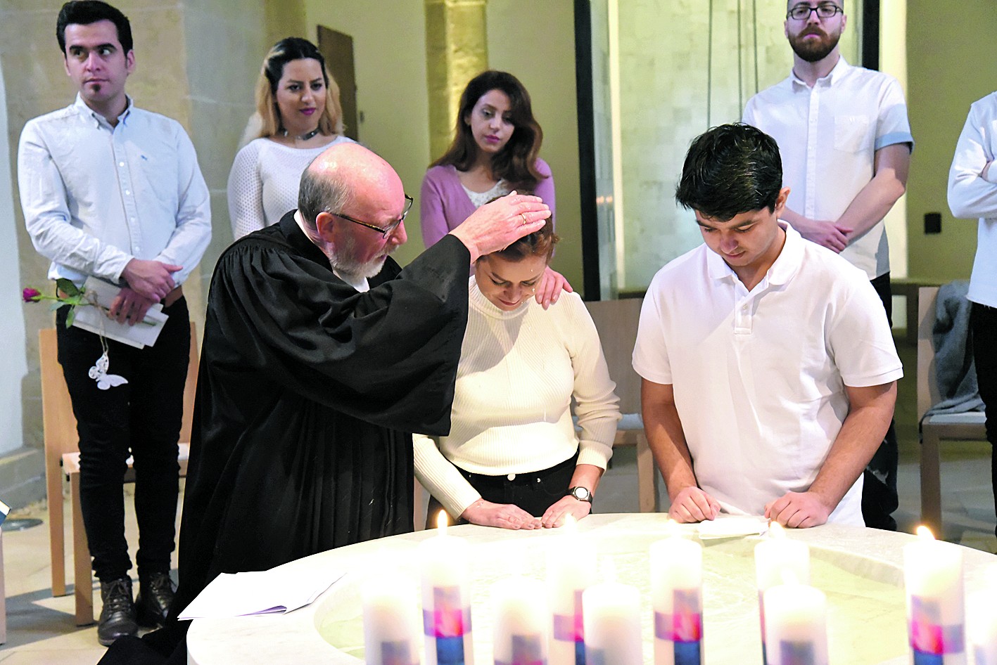Alle Anwesenden sprachen gemeinsam das Glaubensbekenntnis in Deutsch und Farsi. Wie sie es im Vorbereitungskurs gelernt hatten, beantworteten die Iraner die Tauffragen mit „Ja“. Damit bestätigten sie, an Jesus Christus, den Erlöser und Befreier zu glauben und ihm nachzufolgen. Zu den Worten „Jesus spricht: Ich bin das Licht der Welt“ zündeten sie ihre Kerzen an der Osterkerze im Raum der Stille an und nahmen sie mit zum Taufstein.