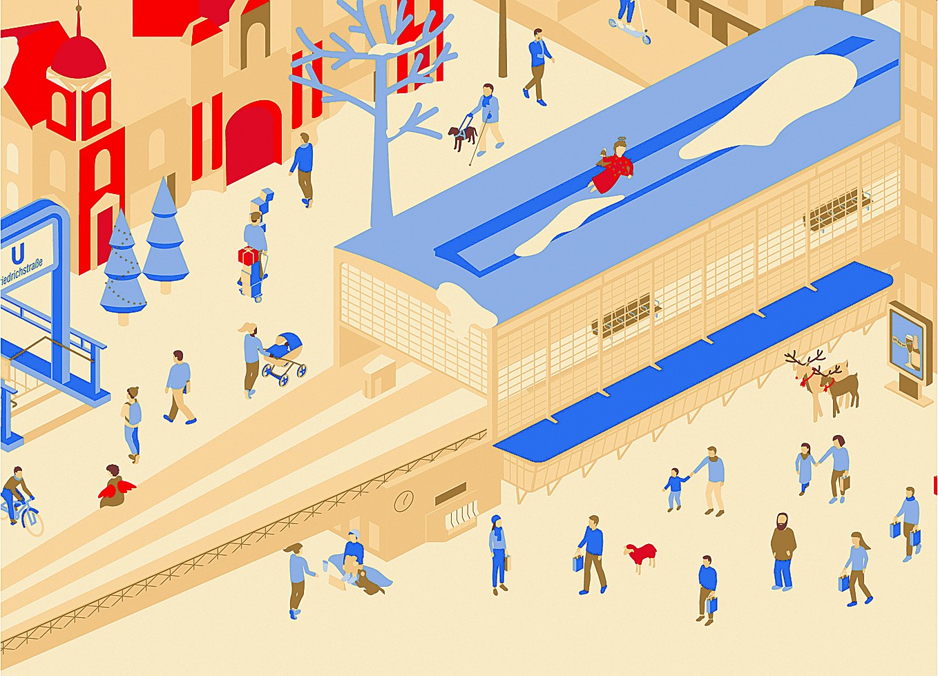 Das weihnachtliche Wimmelbild aus Berlin gibt es auch als Geschenkpapier, als Geschenktüten und als Klappkarte mit Umschlag.