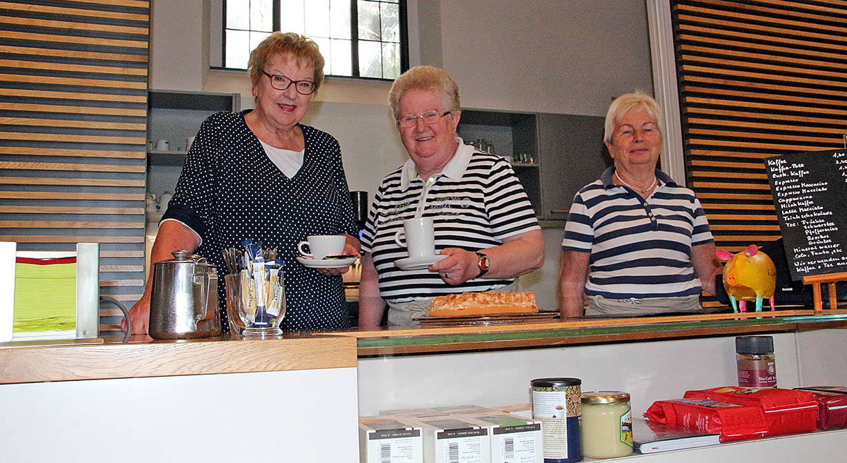 Beim Servieren von selbst gebackenen Torten und Kaffeespezialitäten haben sie für jeden Besucher ein Lächeln und ein paar freundliche Worte. „Wir sind wirklich ein tolles Team“, sagt Hella Schirocky, und sie meint damit nicht nur die drei im Café, sondern die mehr als 40 Frauen und Männer, die regelmäßig die Bedienung übernehmen, Torten backen, einmal in der Woche einen Mittagstisch vorbereiten oder auch für einen Rundgang durch die Kirche zur Verfügung stehen.