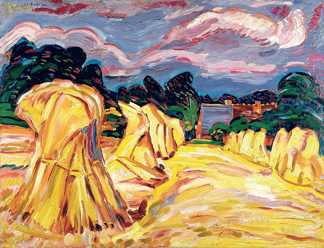 Böckstiegel vertrat im Gegensatz zu Felixmüllers sozialkritischen Darstellungen des Arbeitermilieus einen „romantischen Expressionismus“. Wie seine Vorbilder, die Maler der Gruppe „Die Brücke“ (1905-1913), war er geleitet von der Suche nach Ursprünglichkeit. Seine Motive sind Blumenstillleben, Ernte-Impressionen und immer wieder seine Eltern und die Bauern in Arrode, deren einfache Lebensform und Nähe zur Natur Böckstiegel bewunderte, ohne sie zu idealisieren. Ebenso oft hielt der „Bauernmaler“, wie er sich selbst nannte, seine Ehefrau Hanna – stolz oder verklärt madonnenhaft – und die Kinder Sonja und Vincent im Bild fest.