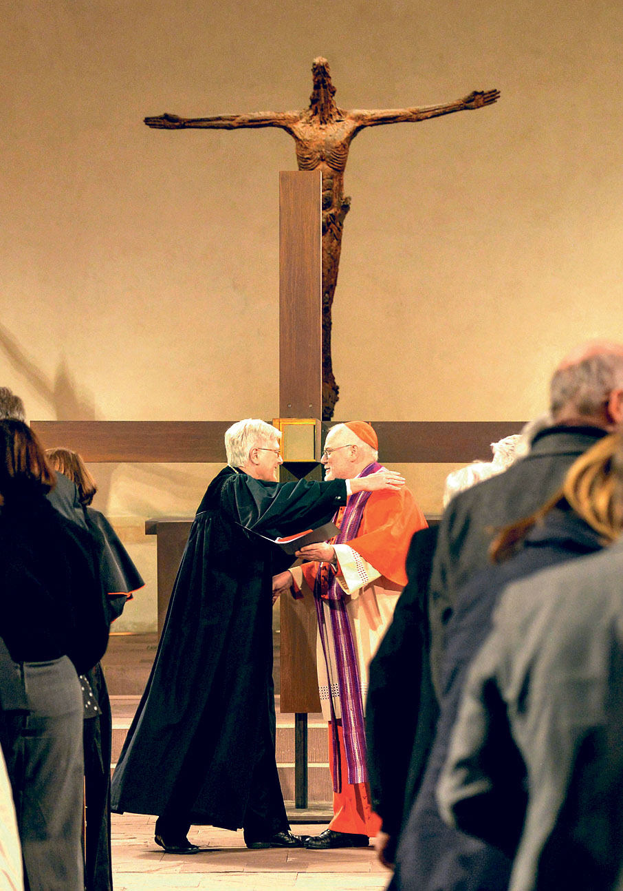 Im schwarzen Talar der Protestanten der eine, im roten Ornat des Kardinals der andere verkörpern sie die unterschiedlichen Traditionen. Und doch duzen sich Marx und Bedford-Strohm in ihrem Vortrag, den sie frei formulieren. Immer wieder blicken sie sich lächelnd an – sie sind sichtlich Freunde, die es satt haben, sich ständig gegenseitig zu verdächtigen. „Heute ist ein Tag der Hoffnung“, bekräftigen sie unter dem großen Beifall der Besucher.