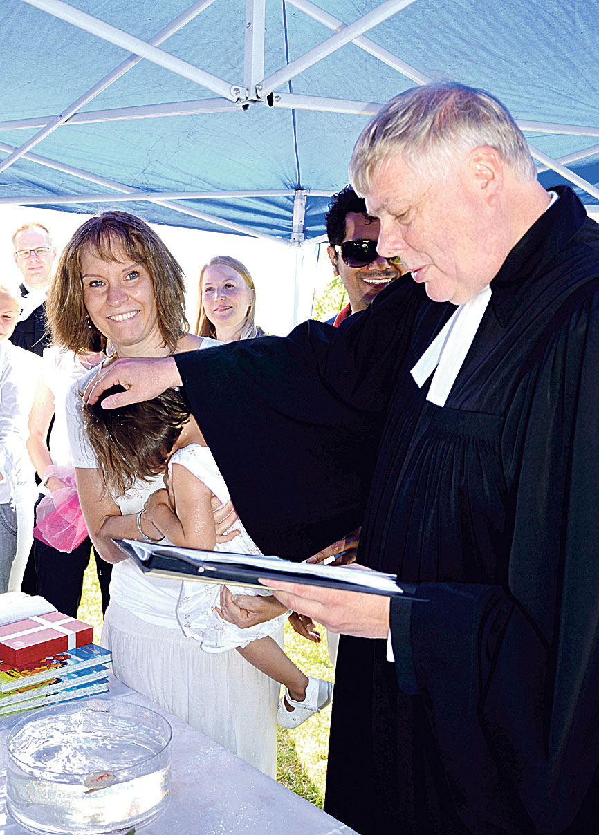 Unter den Pavillons wird heute im Schichtdienst getauft. Erst ist die dreijährige Judith dran, dann treten gleich zwei Täuflinge gemeinsam nach vorn, die 38-jährige Anna Stanke trägt ihre zweijährige Tochter Isabel auf dem Arm. Während die Mutter die Taufzeremonie genießt, protestiert das Töchterchen energisch.