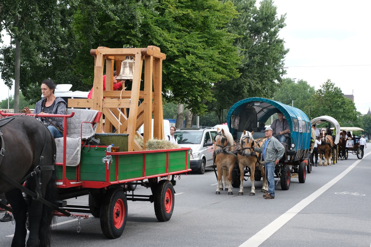 Hamburg (epd). Die «Jerusalemer Friedensglocke» ist am Sonntag mit einem Pferdetreck vom Hamburger Heiligengeistfeld durch Norddeutschland gestartet. Als ein Zeichen des Friedens und der Völkerverständigung werde sie auf einer ersten Etappe durch insgesamt fünf Bundesländer ziehen, sagte der Organisator, der brandenburgische Pfarrer Helmut Kautz. Die Tour mit 14 Pferden und 20 Menschen soll drei Wochen dauern.