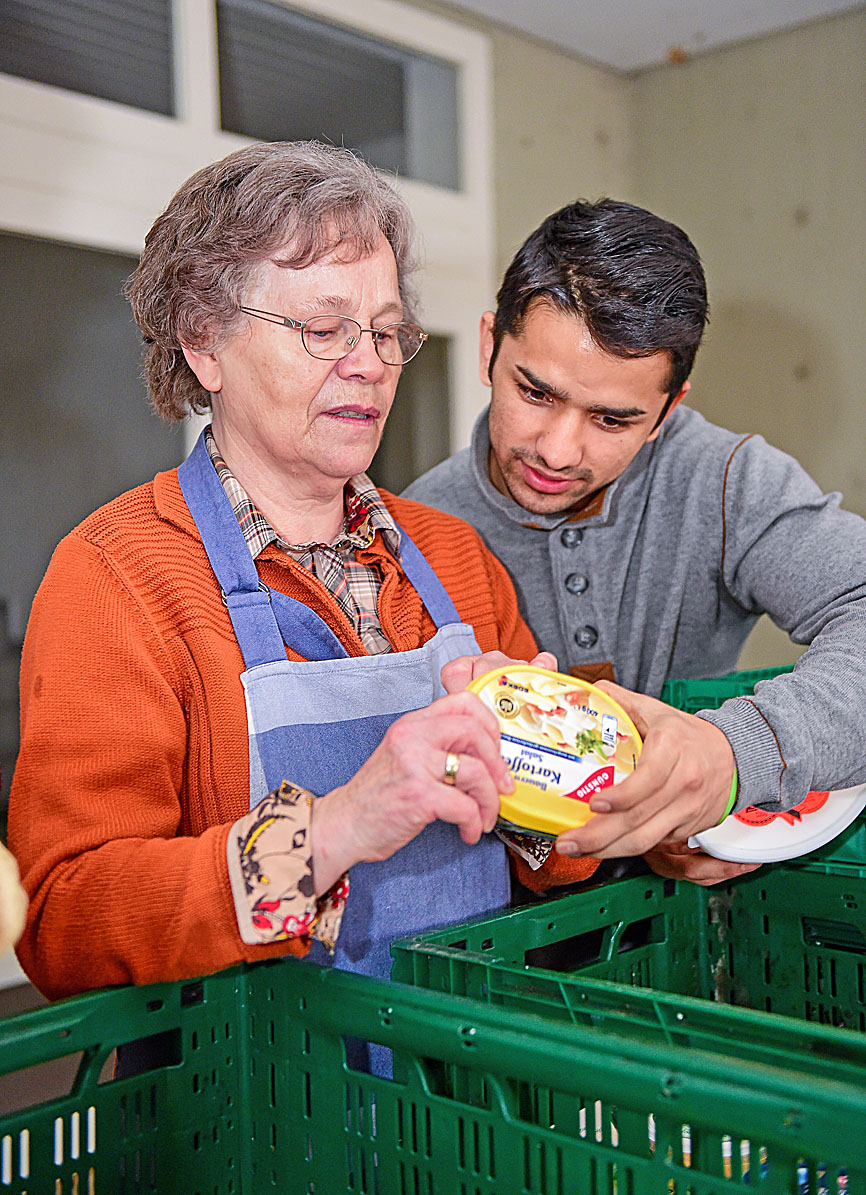 Jetzt aber braucht ihn erstmal die 77-jährige Irmgard Flaig, die ehrenamtlich in Pellahöhe arbeitet. Der Bulli vom „Bielefelder Tisch“ steht mit Spenden vor der Tür. Zwei Dutzend Menschen warten. Zabihullah stellt kistenweise Obst, Gemüse und Lebensmittel auf. Als alles verteilt ist, reinigt und stapelt er die Kästen. „Das ist ein Netter, alle mögen ihn“, meint Flaig über den jungen Helfer, der jetzt eine Werkzeugkiste und einen Bohrer holt. In einem Büro soll ein Schließfach eingebaut werden. „Can, gibst du mir bitte Dübel und Schrauben“, fragt der 75-jährige Ehrenamtliche Manfred Lammert. Auch er findet nur lobende Worte: „Ein feiner Mensch, offen, hilfsbereit – er passt zu uns.“