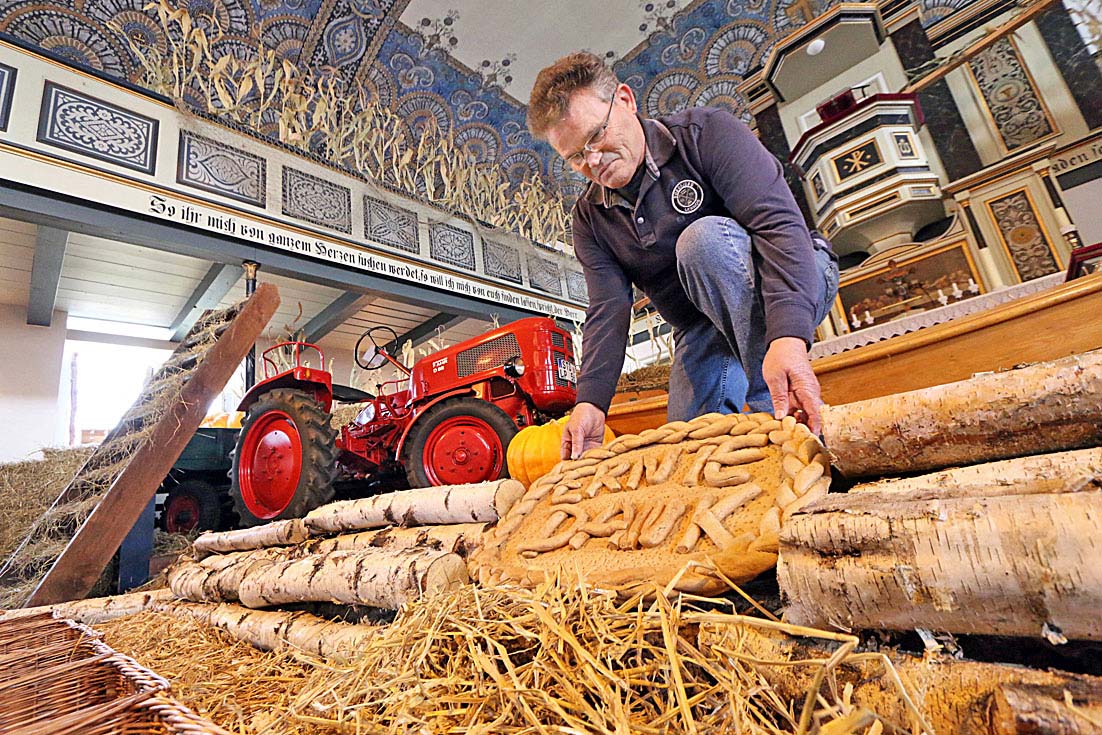 Aus Dankbarkeit für Gottes Gaben schmückt Küster Günther Burwieck alljährlich zum Erntedankfest die evangelische St.-Wulphardi-Kirche im niedersächsischen Freiburg bei Hamburg so üppig, wie es wohl selten zu sehen ist. Über Wochen kommen Hunderte Gäste, um sein Werk zu bestaunen. Drei Wochen Vorbereitungszeit braucht Burwieck, damit alles rechtzeitig fertig wird. Im Januar geht der 71-jährige Küster in den Ruhestand. foto: epd