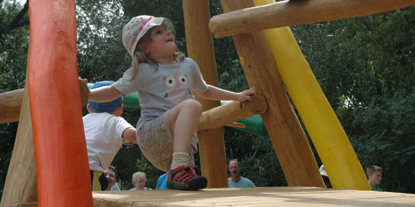 Schließlich singen die jungen Leute aus Israel, Südafrika, Kamerun und Deutschland „Wir gehen in dem Licht des Herrn“ auf Zulu und Englisch. Sie wandern mit den Kindern um den Regenborgen bis Dor Goldin (12) aus Israel und Jakob Duppel (13) aus Deutschland das Band durchschneiden und alle mit Aufstieg, Überquerung und Rutschen beginnen können.