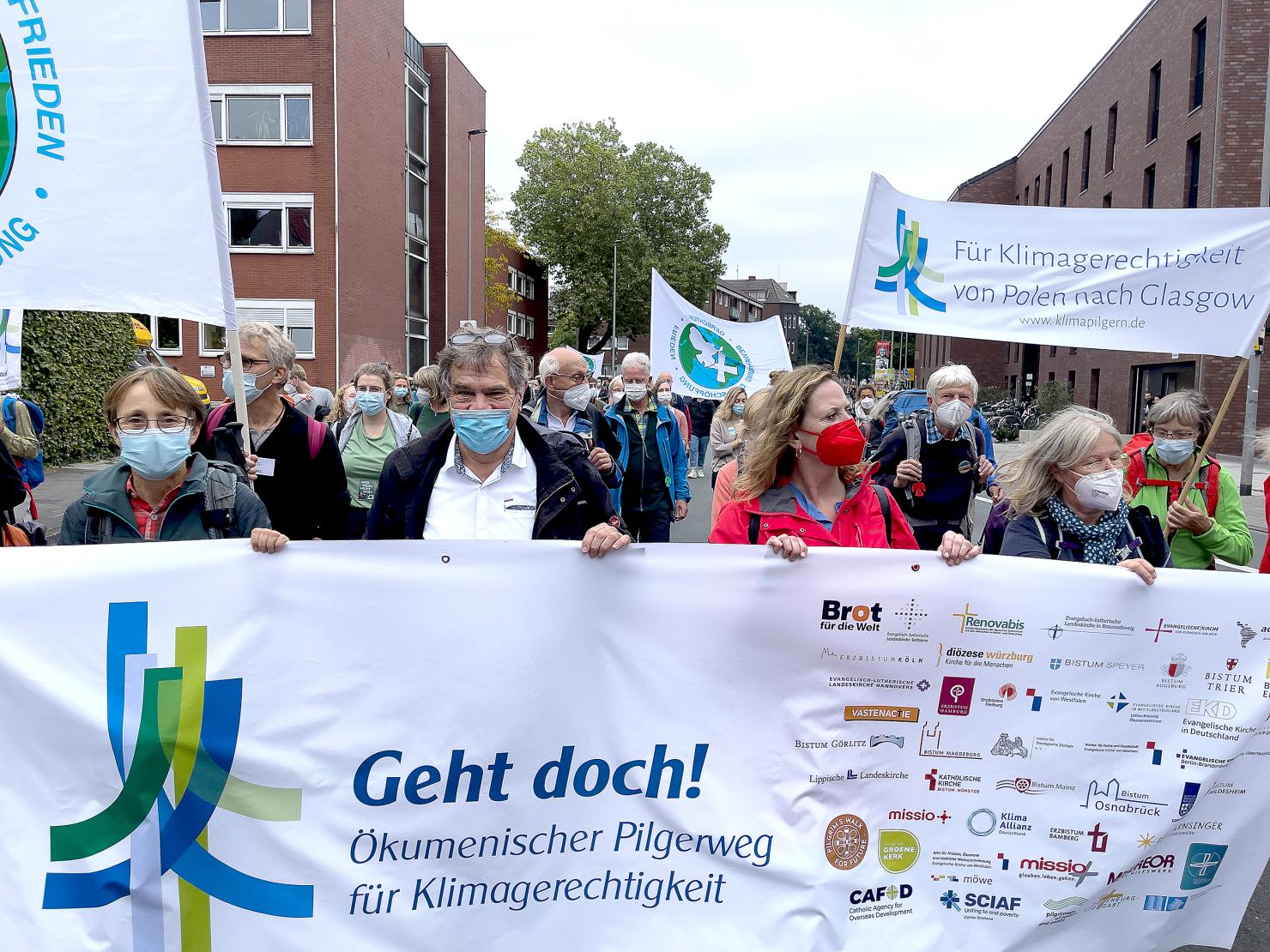 Eins meiner Lieblingsprojekte ist der ökumenische Pilgerweg für Klimagerechtigkeit. Unter dem Motto „Geht doch!“ machen sich seit 2015 Gruppen auf den Weg, um für das Thema Klimagerechtigkeit zu sensibilisieren. Sie verbinden die Orte der UN-Klimakonferenzen und laufen wie im letzten Jahr die rund 1700 Kilometer von Polen nach Glasgow. Es passiert ganz viel, wenn Menschen lange Strecken zusammen wandern und dabei miteinander und mit Menschen auf dem Weg ins Gespräch kommen.