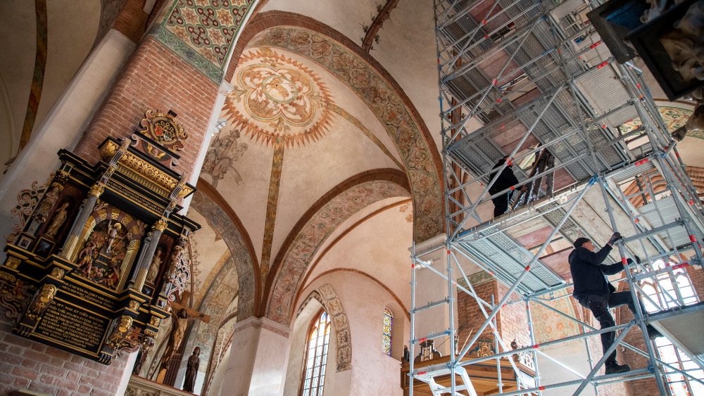 In den vergangenen vier Jahren wurden alle Fugen an der Westfassade erneuert. Zudem mussten zahlreiche Mauersteine ausgetauscht werden. Der heikelste Moment war im Sommer 2020, erinnerte sich Projektkoordinator Pastor Andreas Hamann: Etwa 300 Quadratmeter groß war die Fläche in 50 bis 75 Metern Höhe, die neu gemauert werden musste. Ein Stahlkorsett gab dem Turm damals den nötigen Halt. „Da haben wir Blut und Wasser geschwitzt.“