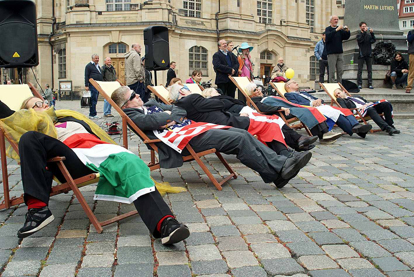 Diese Szene gehört zu der öffentlichen Aktion, die das Bündnis „Erlassjahr.de – Entwicklung braucht Entschuldung“ auf dem Neumarkt in Dresden Ende Mai durchgeführt hat. Die Schläfer in der Liegestühlen stellten die Finanzminister der G-7-Staaten dar, und die Gruppe, die eine große Last zu bewältigen hatte, waren Menschen in hoch verschuldeten Ländern. Am Ende ließen beide Gruppen die Schulden als Ballons in den Himmel fliegen.