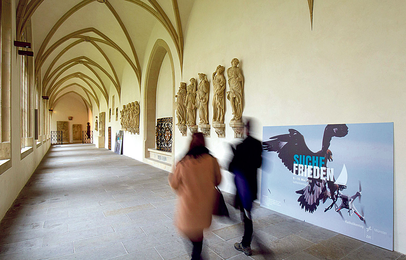Wir feiern in Münster in diesem Jahr den 101. Katholikentag. Und die Stadt und das Jahr geben das Thema vor: Vor 370 Jahren war der westfälische Friede, vor 400 Jahren begann der Dreißigjährige Krieg und vor 100 Jahren ging der Erste Weltkrieg zu Ende. Die Friedensthematik liegt deswegen auf der Hand – und wir haben den Katholikentag deswegen unter das Motto aus dem Psalm 34 gestellt: „Suche Frieden“.