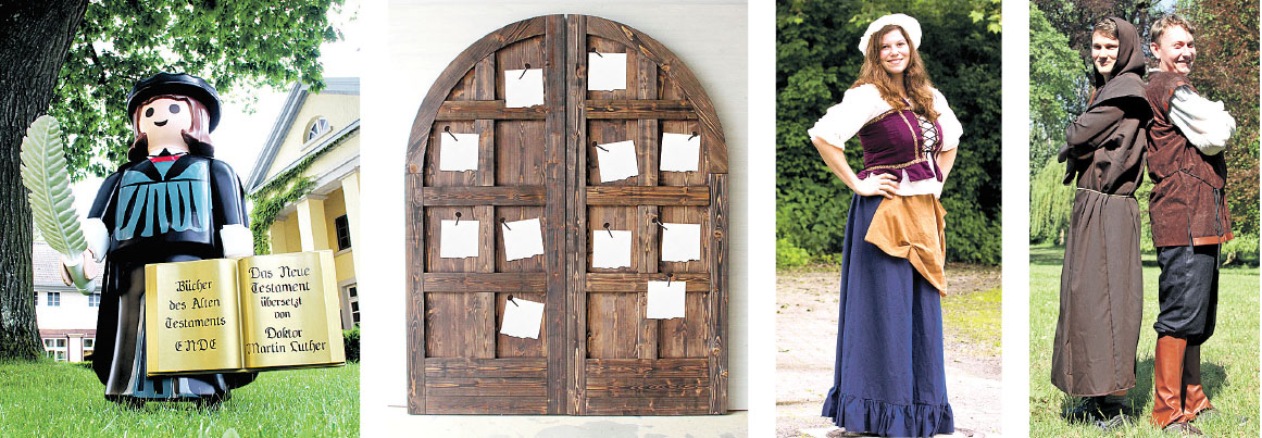 Im Angebot sind beispielsweise Playmobil-Lutherfiguren mit einer Höhe von fast 1,50 Metern. Sie eignen sich besonders für niederschwellige Foto-Aktionen. Auch nachgebildete Kirchentüren – Symbol des als „Thesenanschlag“ in die Geschichte eingegangenen Ereignisses, das den Beginn der Reformation markiert – mit einer Höhe von zwei Metern stehen zur Ausleihe bereit. Diese können von Passanten oder Besuchern von Veranstaltungen genutzt werden, um eigene Thesen anzunageln.