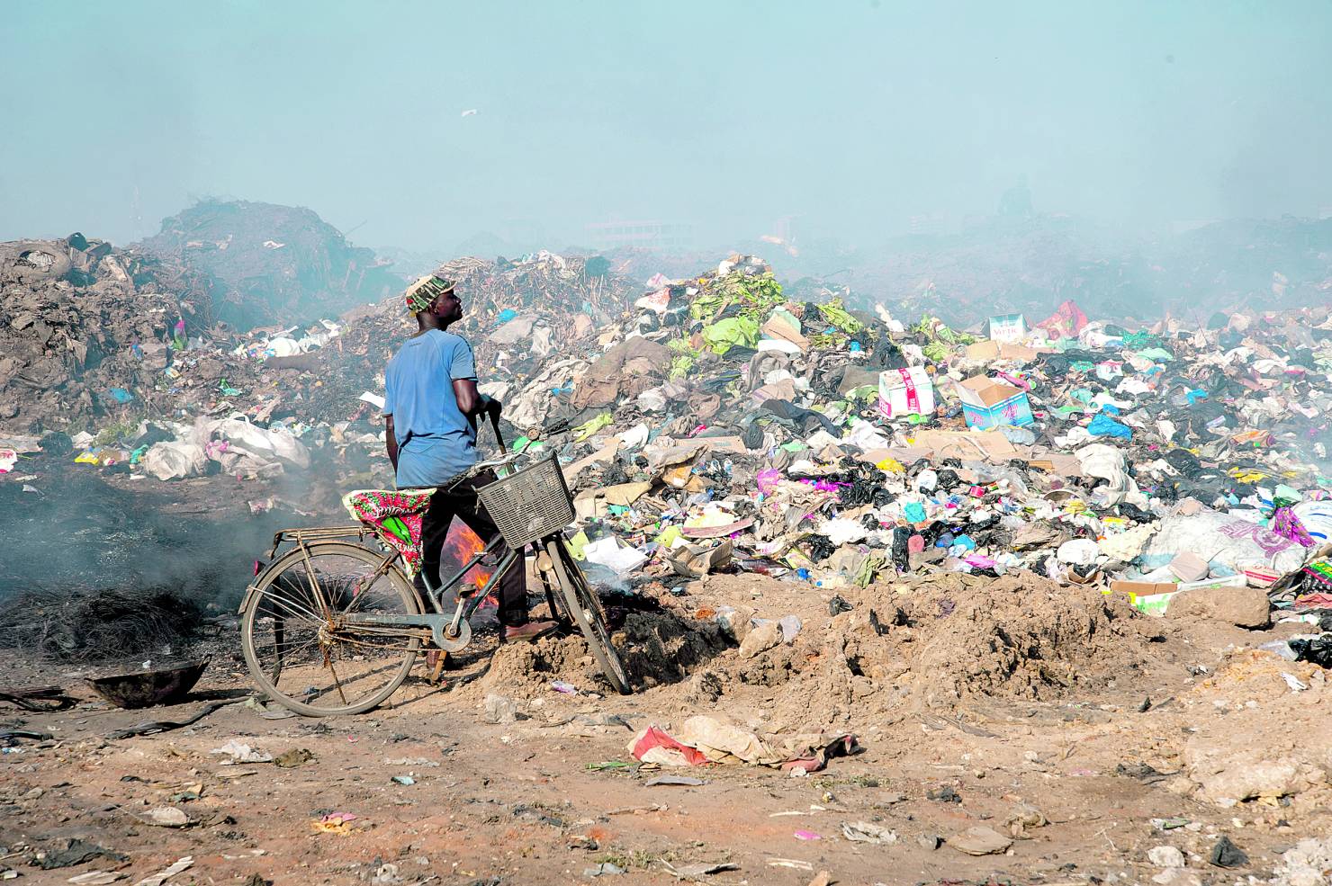 Ich bin verwirrt. Warum bewacht ein Mann sein Feuer? Er geht ein paar Schritte weiter. Suchend schaut er sich um. Er findet einen Laptop und wirft ihn ins Feuer. Jetzt erkenne ich: Da brennen Kabel, Computerplatinen, Bruchstücke von Elektrogeräten. Das Feuer brennt nicht zufällig. Es ist sein Arbeitsplatz. Er hustet immer wieder. Er versucht, die Metalle aus dem Müll herauszuschmelzen und riskiert dabei seine Gesundheit. Kleine, herausgelöste Metallstücke wird er später verkaufen.
