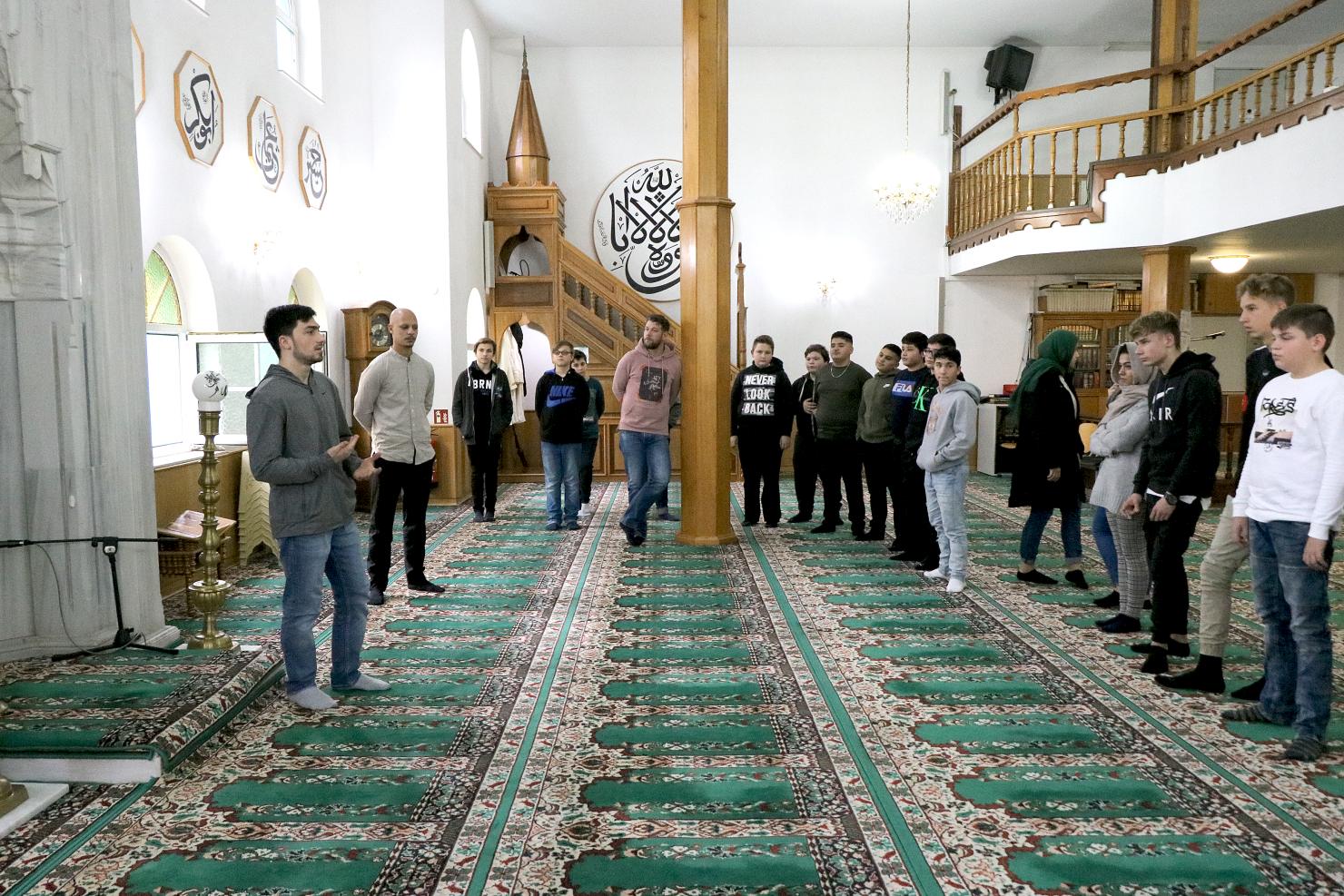 Anschließend führen die beiden 19-Jährigen durch die Moschee und beantworten alle Fragen zu Gebetsnische, Lehrstuhl und Predigtkanzel. Von den 30 Schülerinnen und Schülern sind 20 muslimisch, neu christlich und einer konfessionslos.