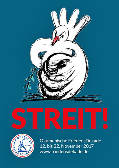 BONN – Das Plakatmotiv der diesjährigen Ökumenischen Friedensdekade steht fest. Die Auswahl fiel auf einen Entwurf von Antje Hubold, in dessen Zentrum eine in provokanter Pose dargestellte Friedenstaube steht, wie der Trägerkreis in Bonn mitteilte. Das Motto der diesjährigen Aktion lautet „Streit!“ und soll auf „enorme finanzielle Zuwächse im bundesdeutschen Militärhaushalt“ hinweisen sowie Wege zu einer demokratischen Streitkultur aufzeigen.