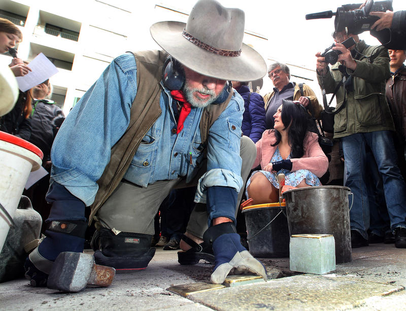 Der Kölner Künstler, der im Oktober 70 geworden ist, hat seitdem rund 63.000 "Stolpersteine" verlegt, bis zu 500 sind es im Monat. Die "Steine" sind kleine Würfel aus Beton, auf denen oben die Messingtafel eingelassen ist, zehn mal zehn Zentimeter groß. Auf diesen Tafeln erinnert Demnig an Menschen, die dem Nationalsozialismus zum Opfer fielen. Er nennt seine "Stolpersteine" "das größte dezentrale Mahnmal der Welt".