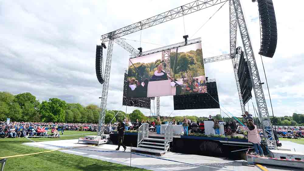 Auf großen Leinwänden wird der Schlussgottesdienst im Stadtpark gezeigt Foto: epdbild / Stephan Wallocha